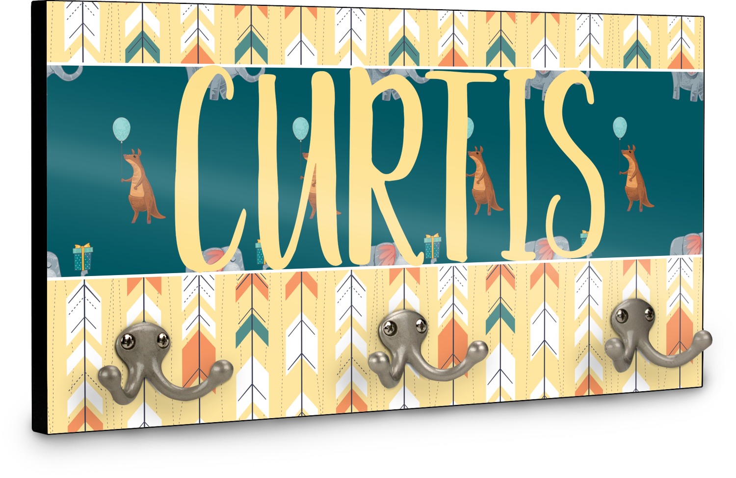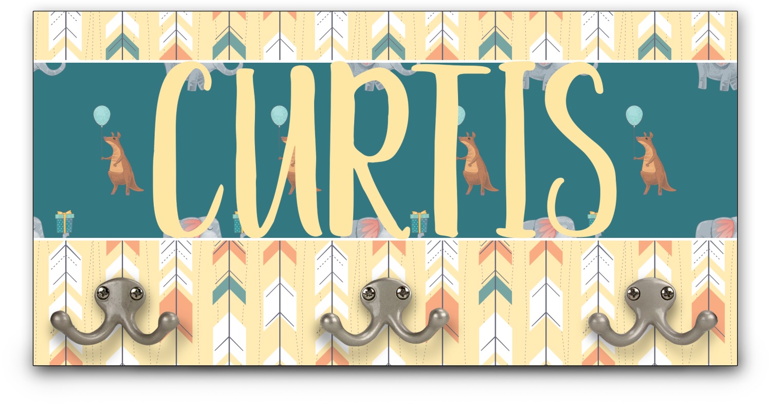 This coat rack is the perfect way to add some personality to your wall or entryway. The board is made of a strong maple that is approximately 16" x 8". The three 2-prong hooks are a sturdy metal that have three screws attaching them to the board. Your design is printed right onto the front of the board while the back and sides are a simple black.