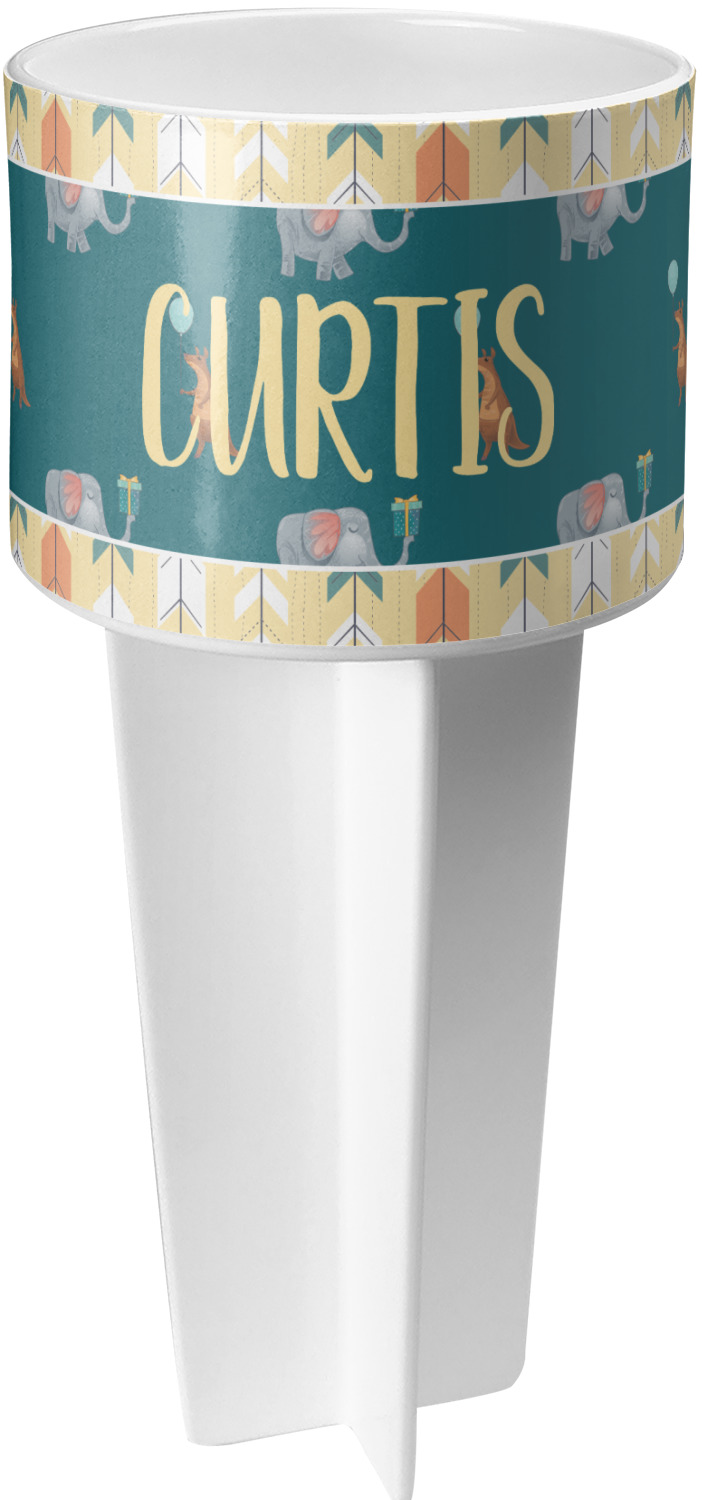 This cup holder has a large stake at its bottom that anchors it to the sand or ground below, while the cup holder rests above the stake. The entire drink holder is made of durable plastic and displays your customization around the cup holder portion. We sell these personalized beach spikers in two different colors: black and white.