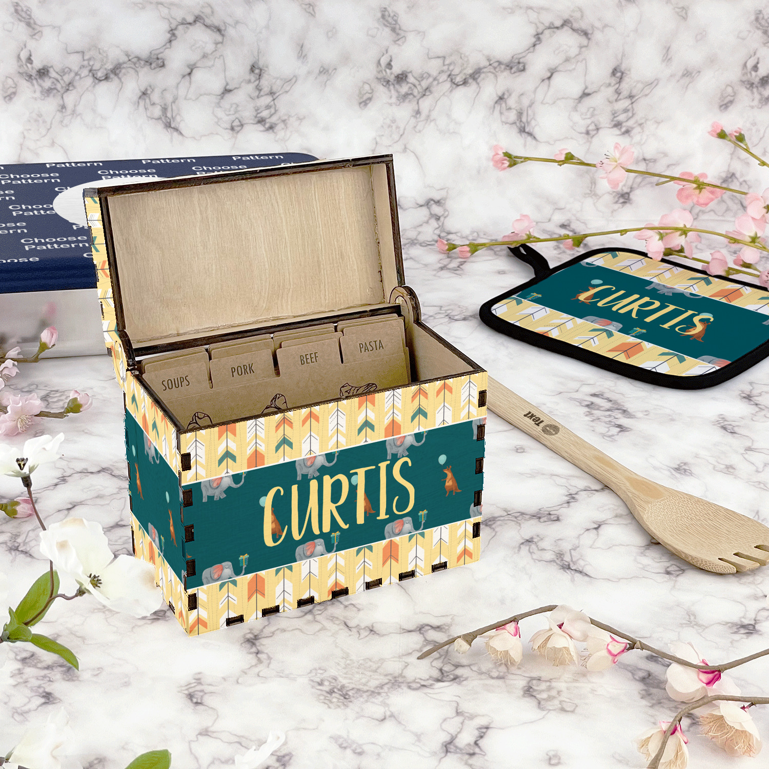 Using our design library you can design your recipe box to be personalized just for you. We will then laser engrave it and assemble it and have it ready for you to insert your recipe cards when you recieve it.