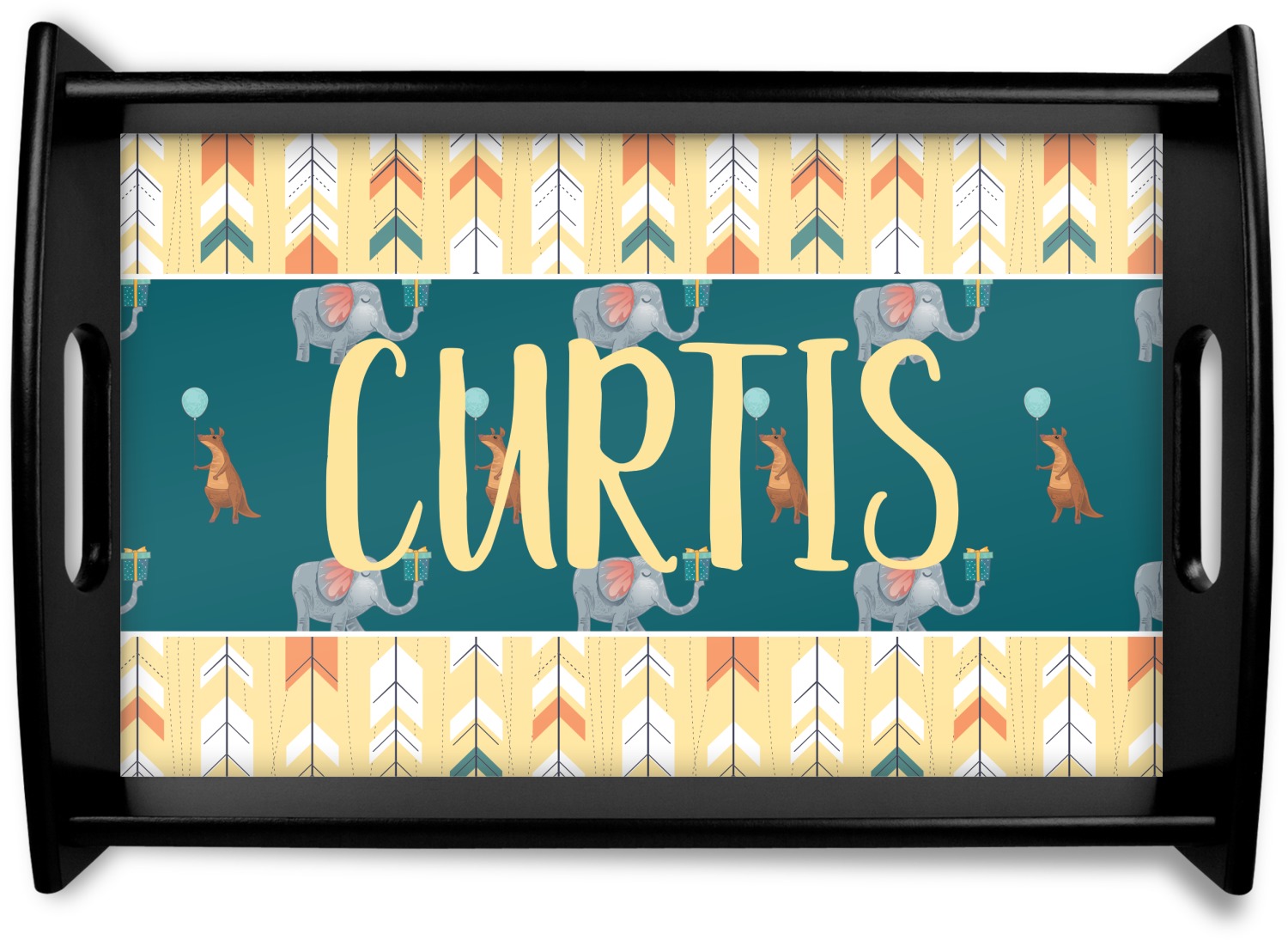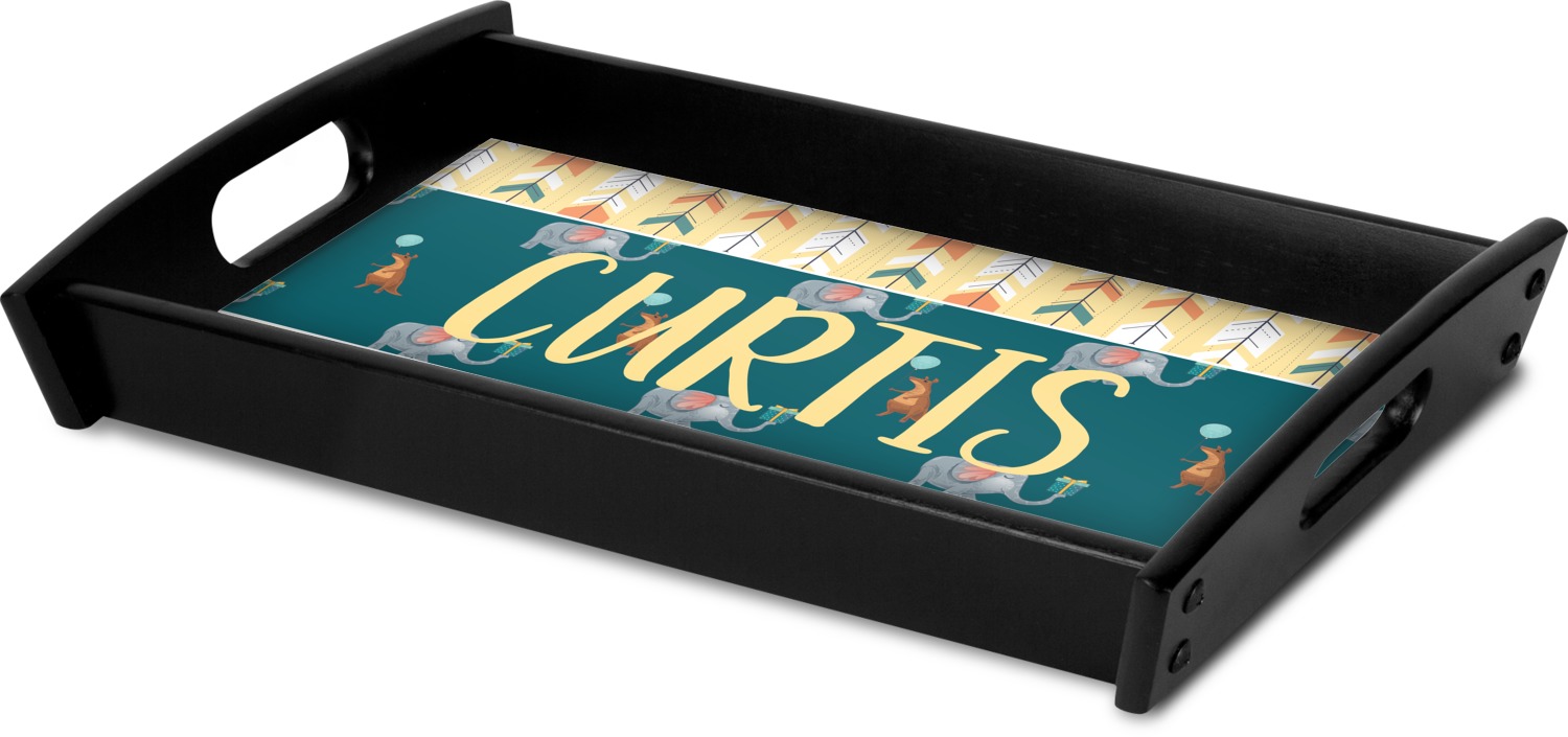 This serving tray with handles features square edges and two rounded sides, creating a very modern look. Each side is fabricated from a beautifully cut, natural wood. The bottom of the interior of the tray displays your customized design in bright, vibrant color. The tray is sold in both a black color and a natural wood look. Each variation of the wood serving tray has two sizes: Small, which is 14" x 10" x 2.25", and Large, which is 19.5" x 13.5" x 2.75".