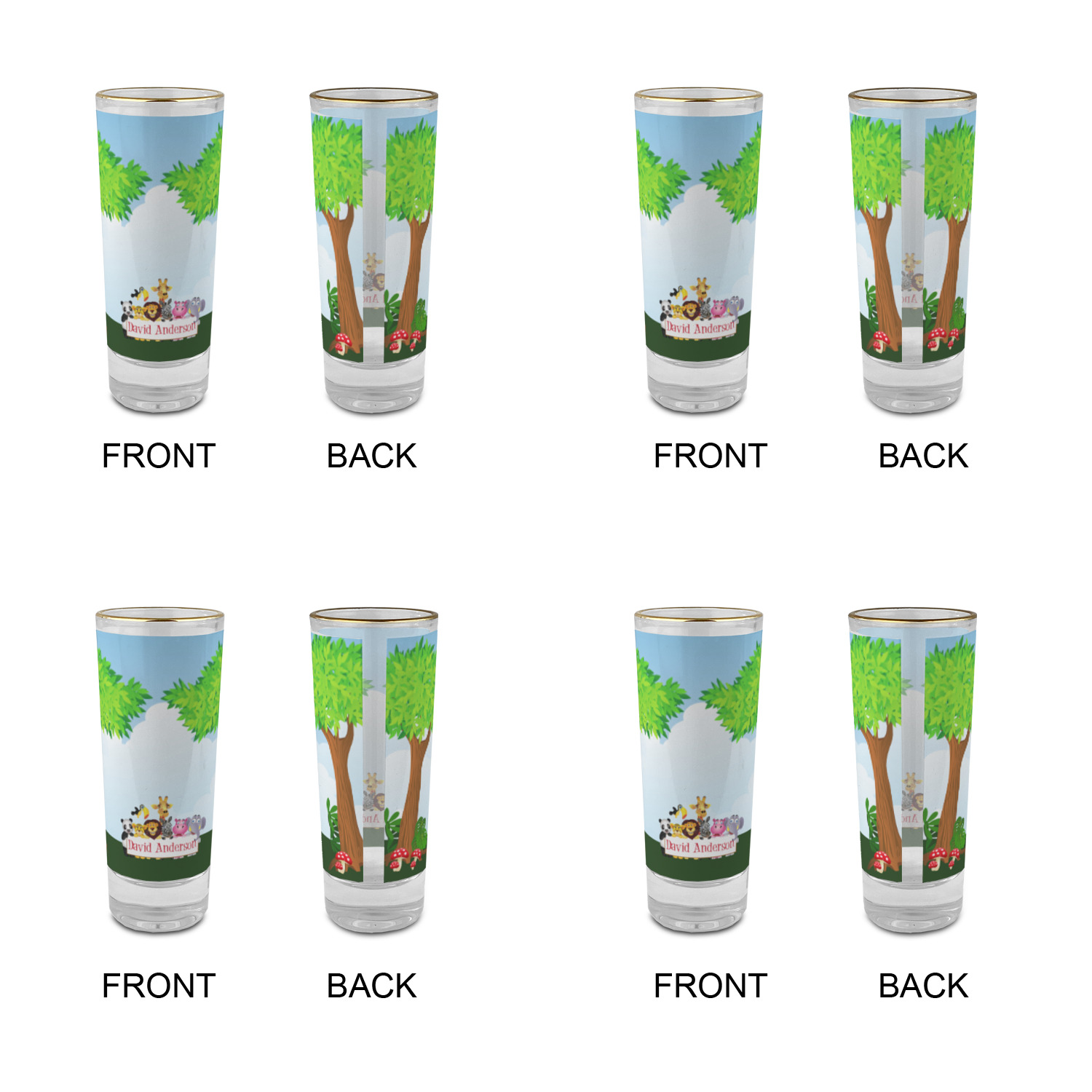 These glass shooter glasses are printed in full color with the design of your choice. These are a tall shooter 2 oz size and stand 4" tall. The print is a full wrap design to boldly display your personalization.