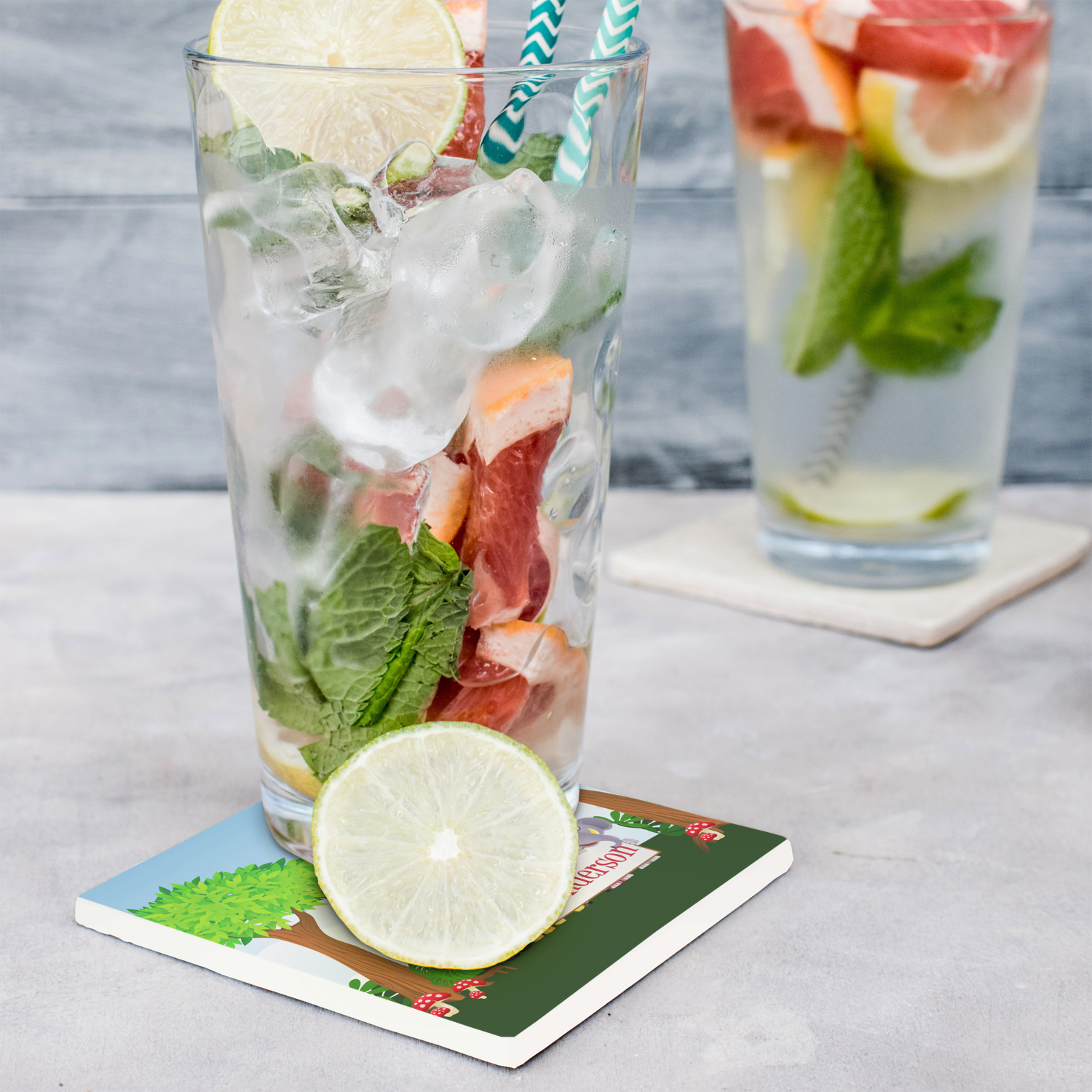 These customized stone coasters are perfect for use with beverages that are served in drinkware that "sweat". When cocktails, sodas, iced tea, water, etc. are served with ice in a regular glasses (non insulated glasses), they release condensation that drips down the outside of the glasses.