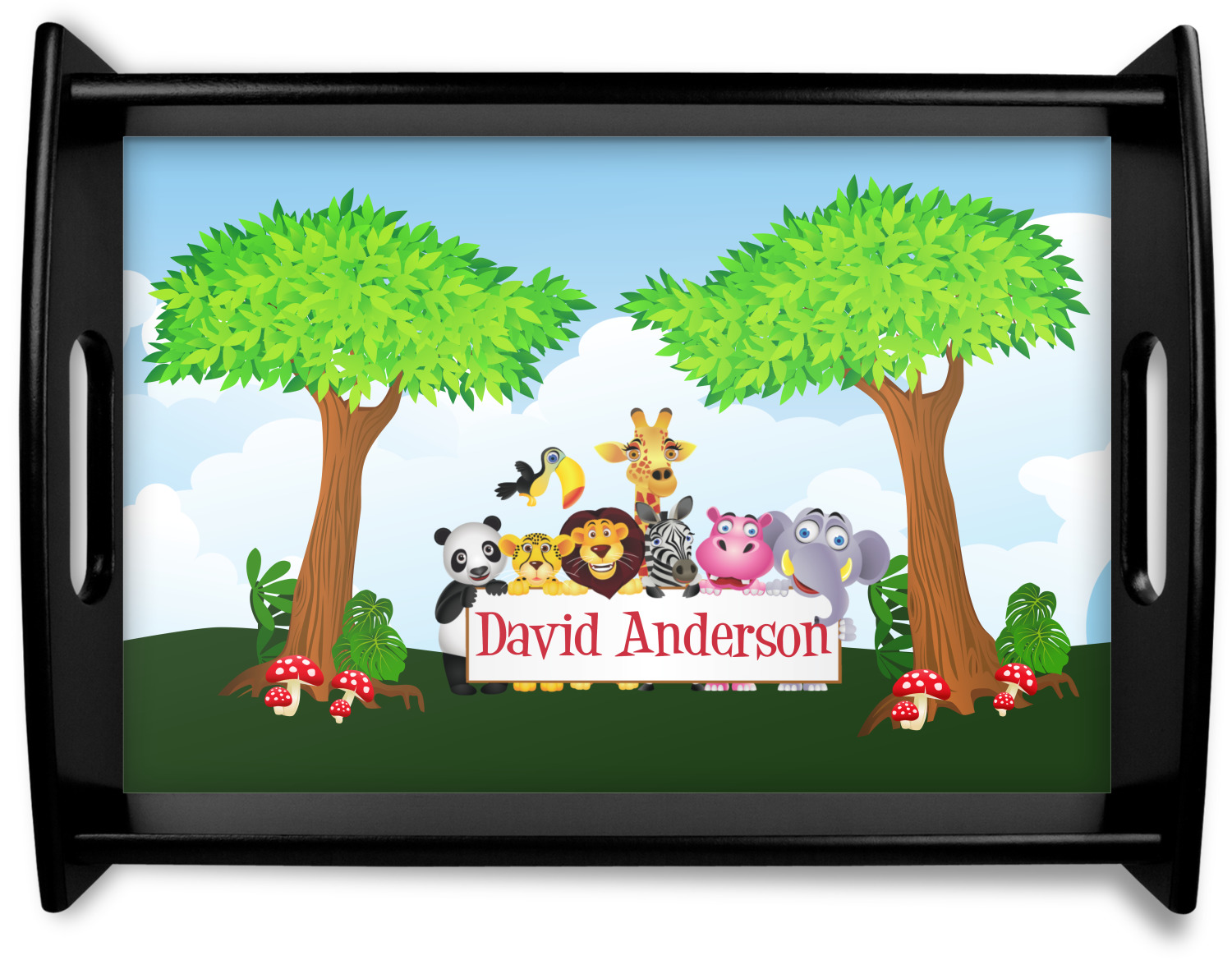 This serving tray with handles features square edges and two rounded sides, creating a very modern look. Each side is fabricated from a beautifully cut, natural wood. The bottom of the interior of the tray displays your customized design in bright, vibrant color. The tray is sold in both a black color and a natural wood look. Each variation of the wood serving tray has two sizes: Small, which is 14" x 10" x 2.25", and Large, which is 19.5" x 13.5" x 2.75".