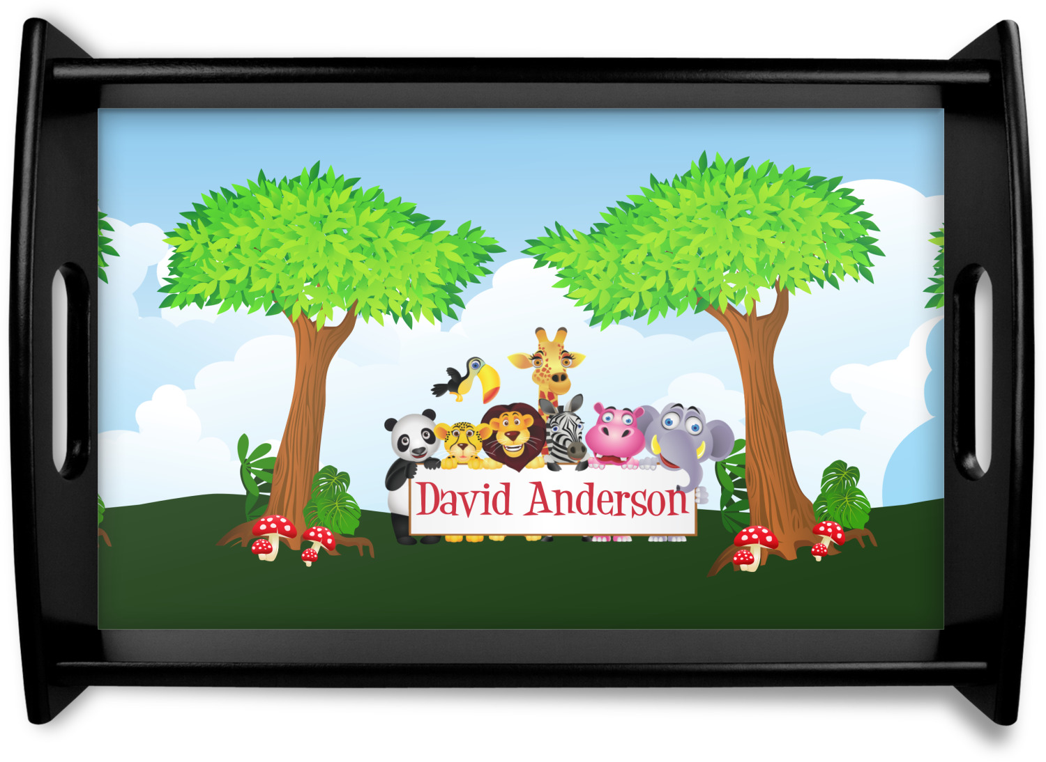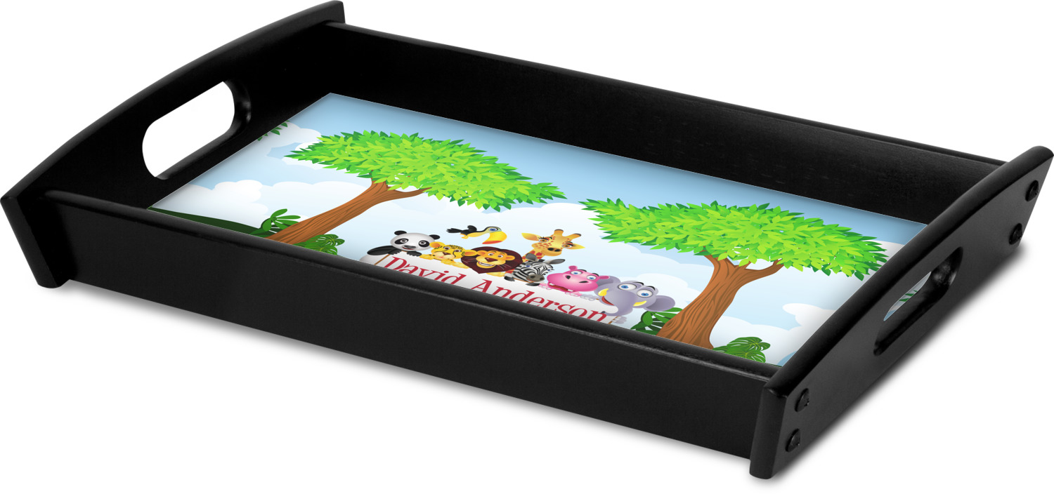 This serving tray with handles features square edges and two rounded sides, creating a very modern look. Each side is fabricated from a beautifully cut, natural wood. The bottom of the interior of the tray displays your customized design in bright, vibrant color. The tray is sold in both a black color and a natural wood look. Each variation of the wood serving tray has two sizes: Small, which is 14" x 10" x 2.25", and Large, which is 19.5" x 13.5" x 2.75".