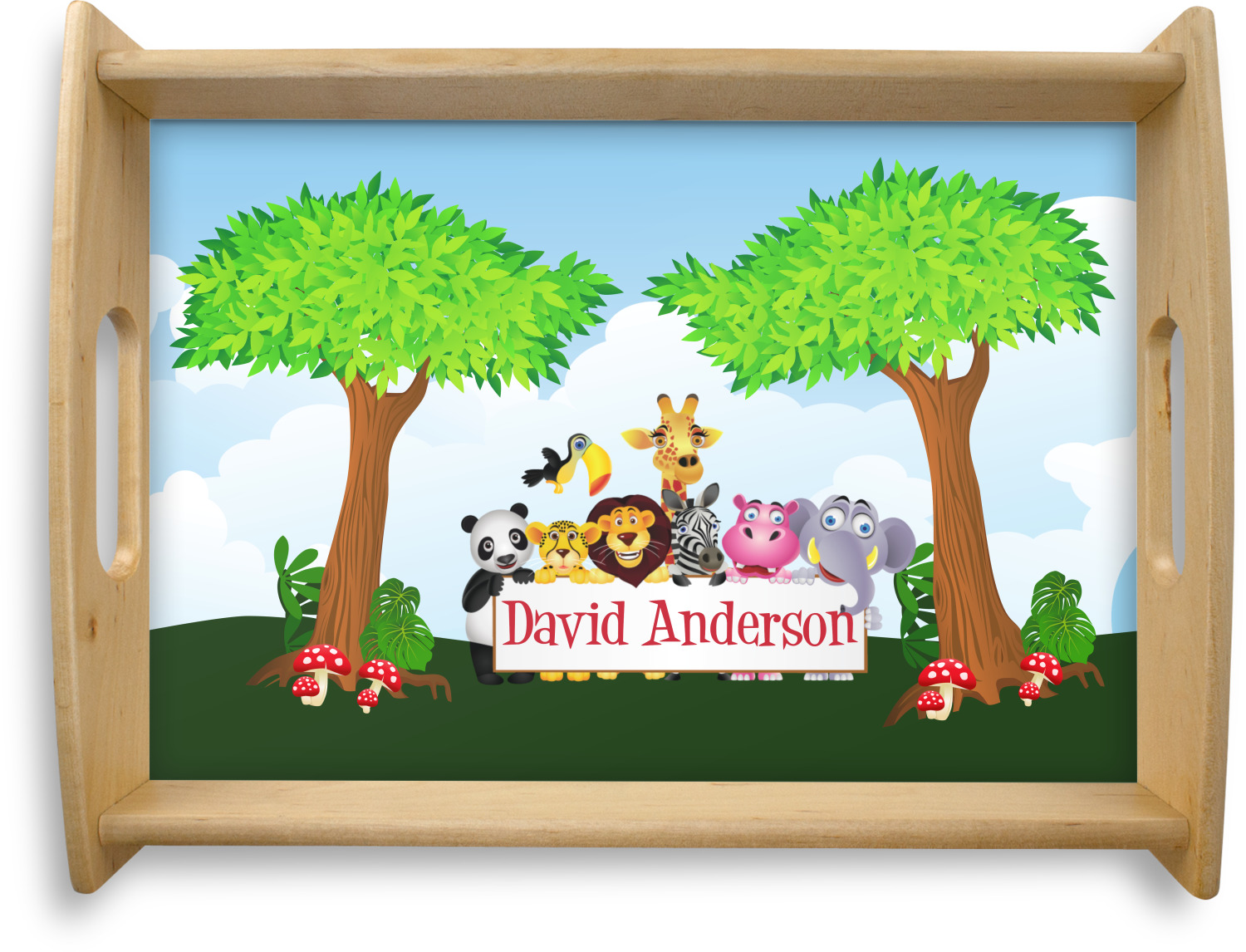 This serving tray with handles features square edges and two rounded sides, creating a very modern look. Each side is fabricated from a beautifully cut, natural wood. The bottom of the interior of the tray displays your customized design in bright, vibrant color. The tray is sold in both a black color and a natural wood look. Each variation of the wood serving tray has two sizes: Small, which is 14" x 10" x 2.25", and Large, which is 19.5" x 13.5" x 2.75".