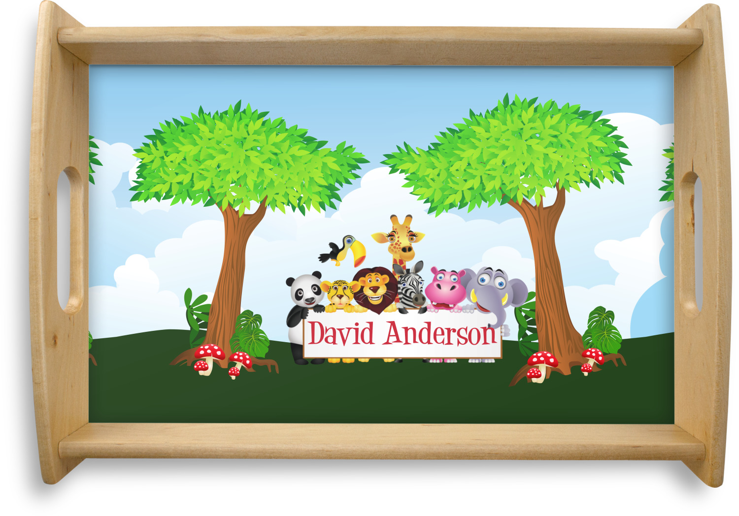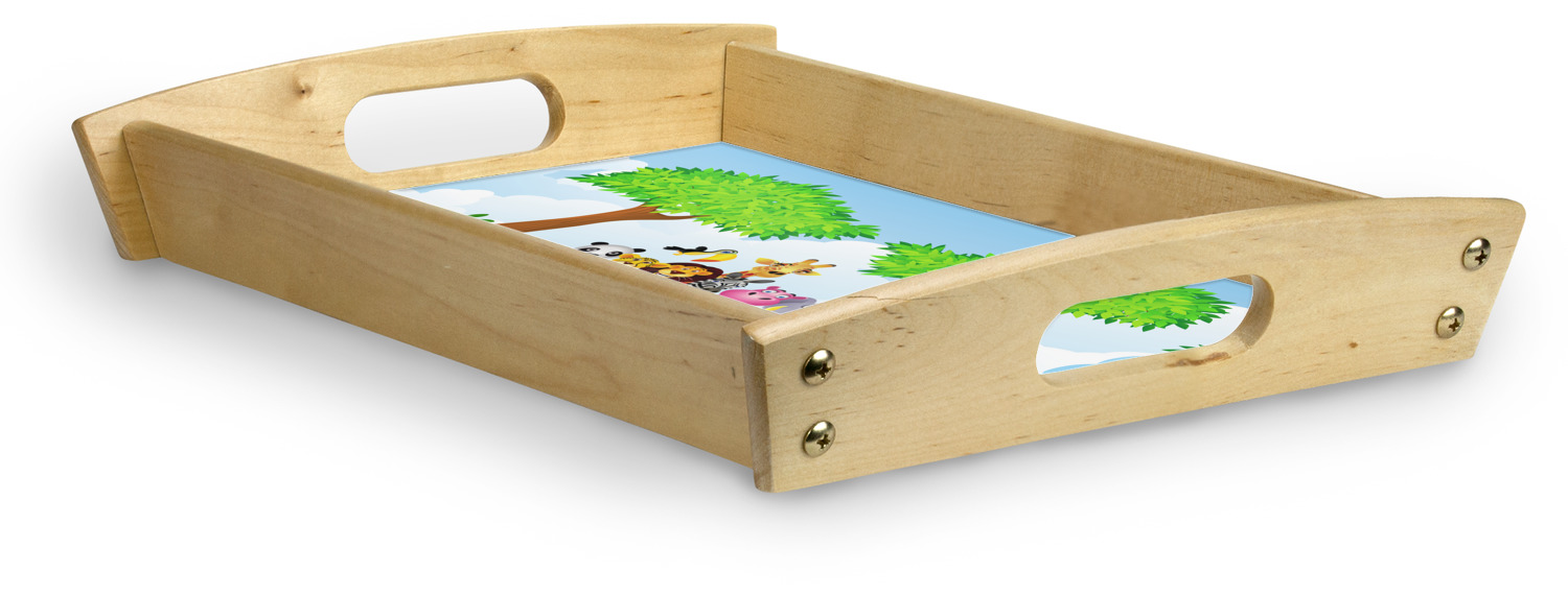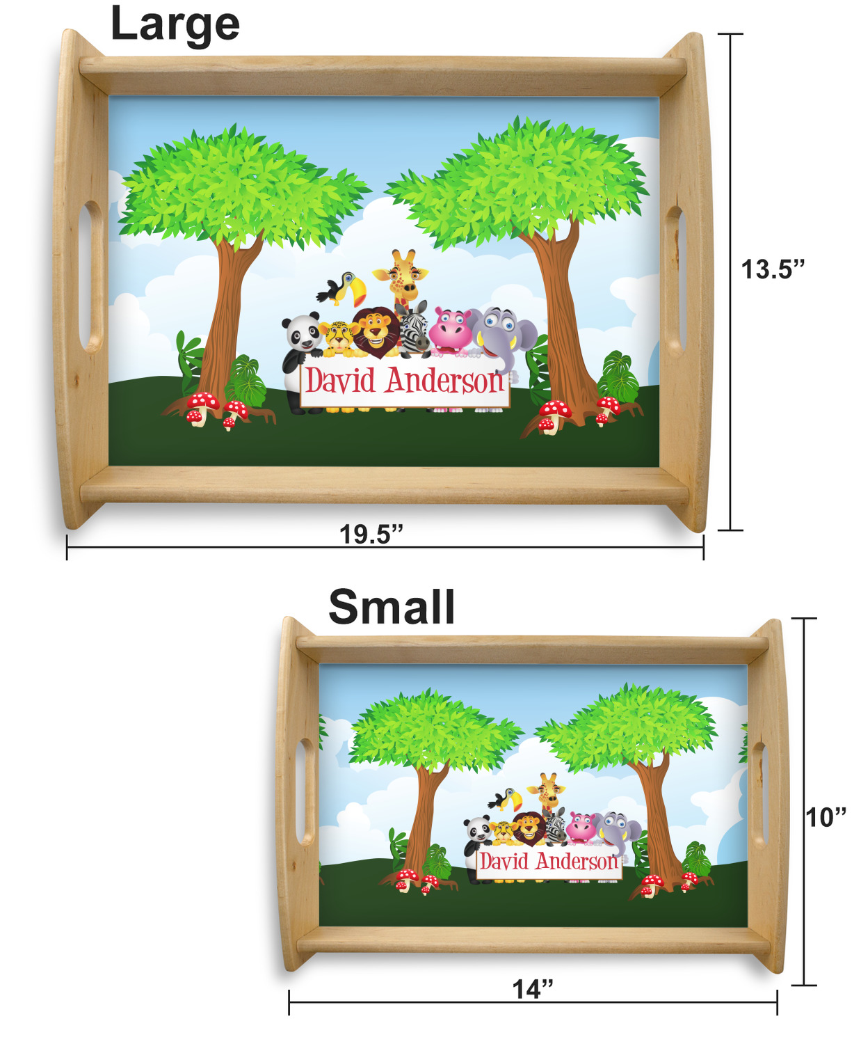 This serving tray with handles features square edges and two rounded sides, creating a very modern look. Each side is fabricated from a beautifully cut, natural wood. The bottom of the interior of the tray displays your customized design in bright, vibrant color. The tray is sold in both a black color and a natural wood look. Each variation of the wood serving tray has two sizes: Small, which is 14" x 10" x 2.25", and Large, which is 19.5" x 13.5" x 2.75".