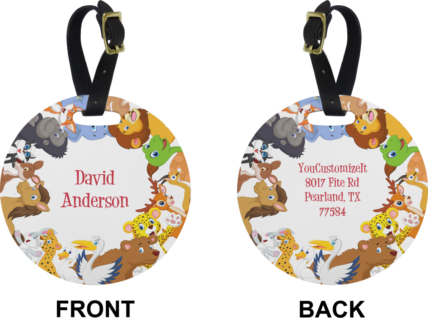These personalized bag tags are sold in a variety of shapes, so that you may find the product that meets your vision exactly. We sell a round luggage tag, which measures at approximately 4" x 4". Our square luggage tag is about 3.5" x 3.5", while our rectangular version is 2.75" x 4 ".