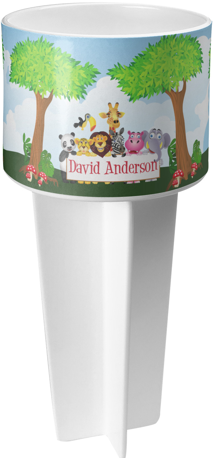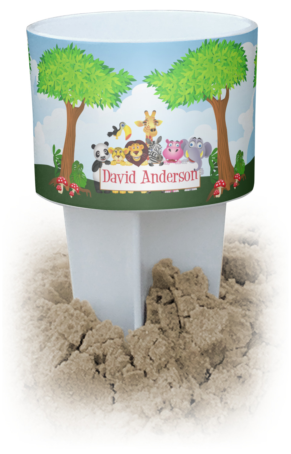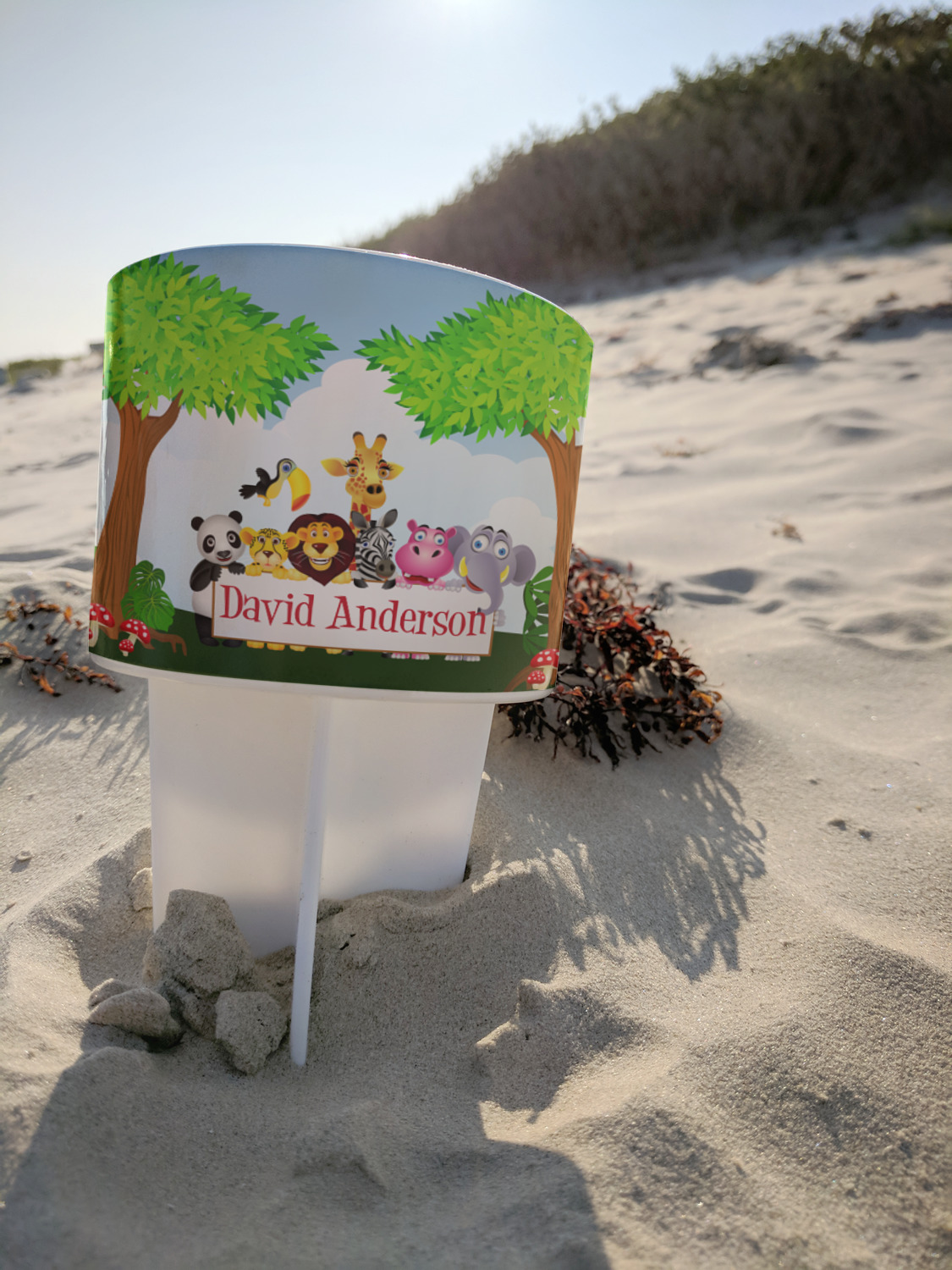 This cup holder has a large stake at its bottom that anchors it to the sand or ground below, while the cup holder rests above the stake. The entire drink holder is made of durable plastic and displays your customization around the cup holder portion. We sell these personalized beach spikers in two different colors: black and white.