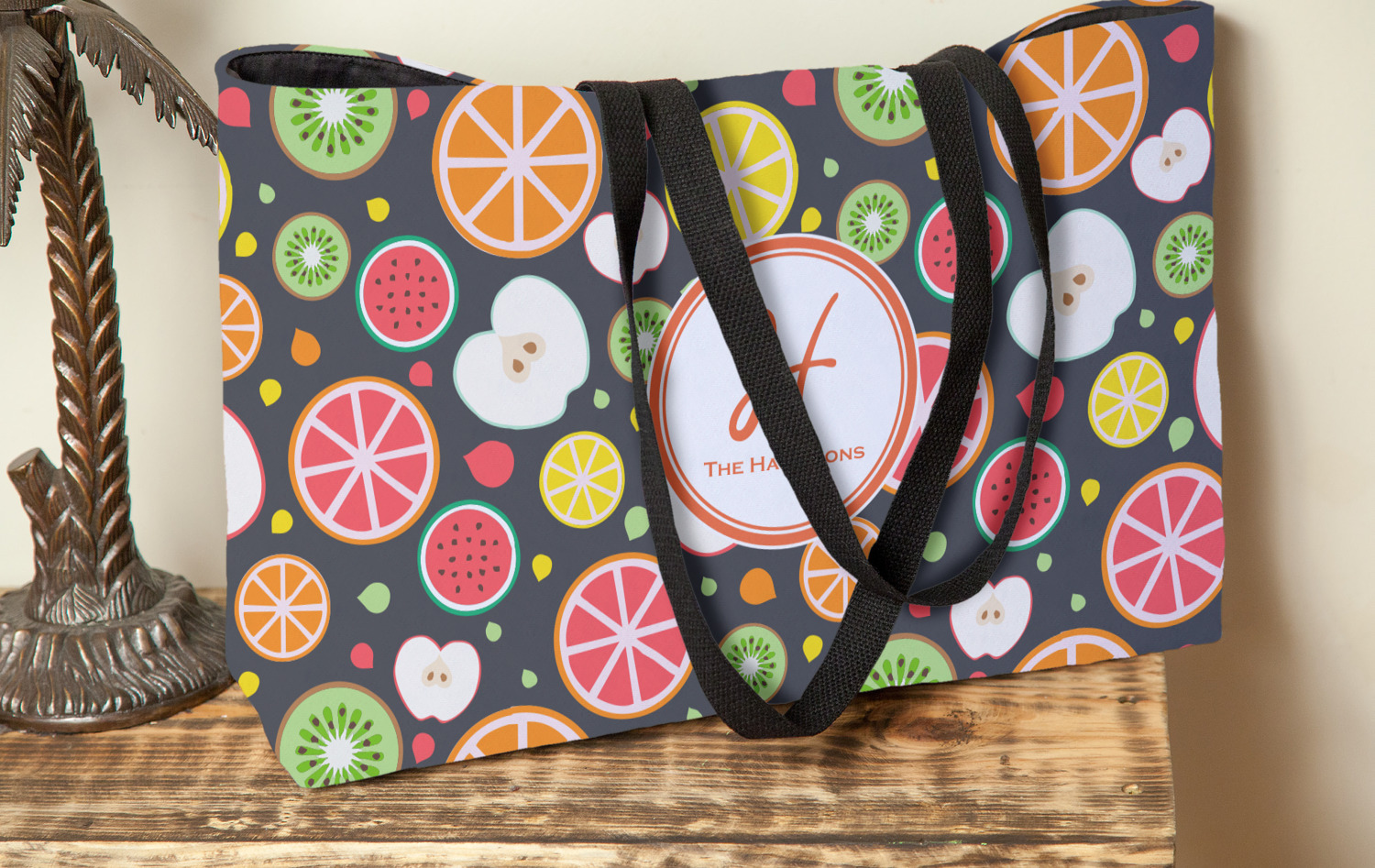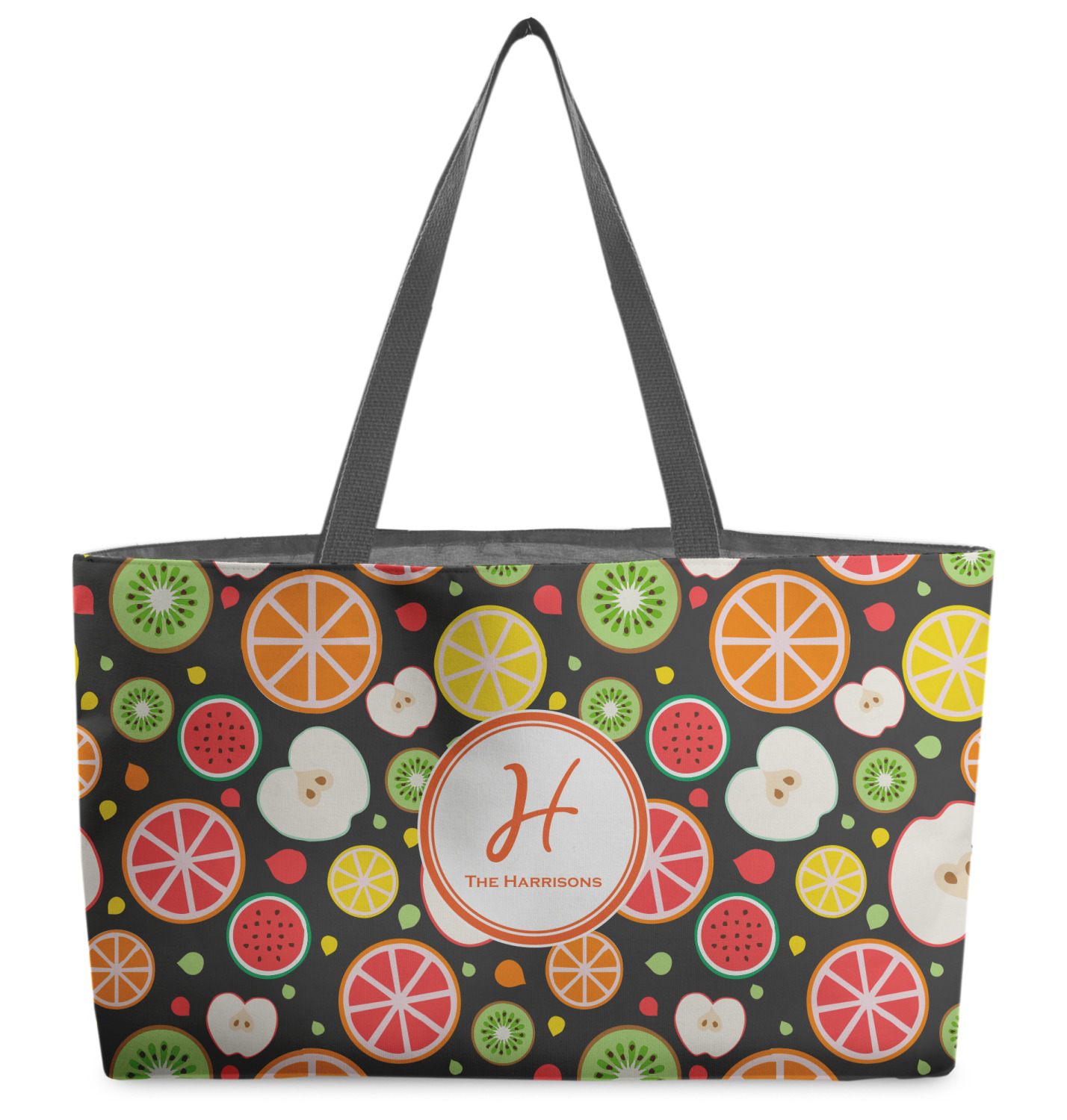 These beach totes are handmade here in the USA. Fabric is printed with your design. The tote is then sewn from the fabric pieces, lining and handles added.