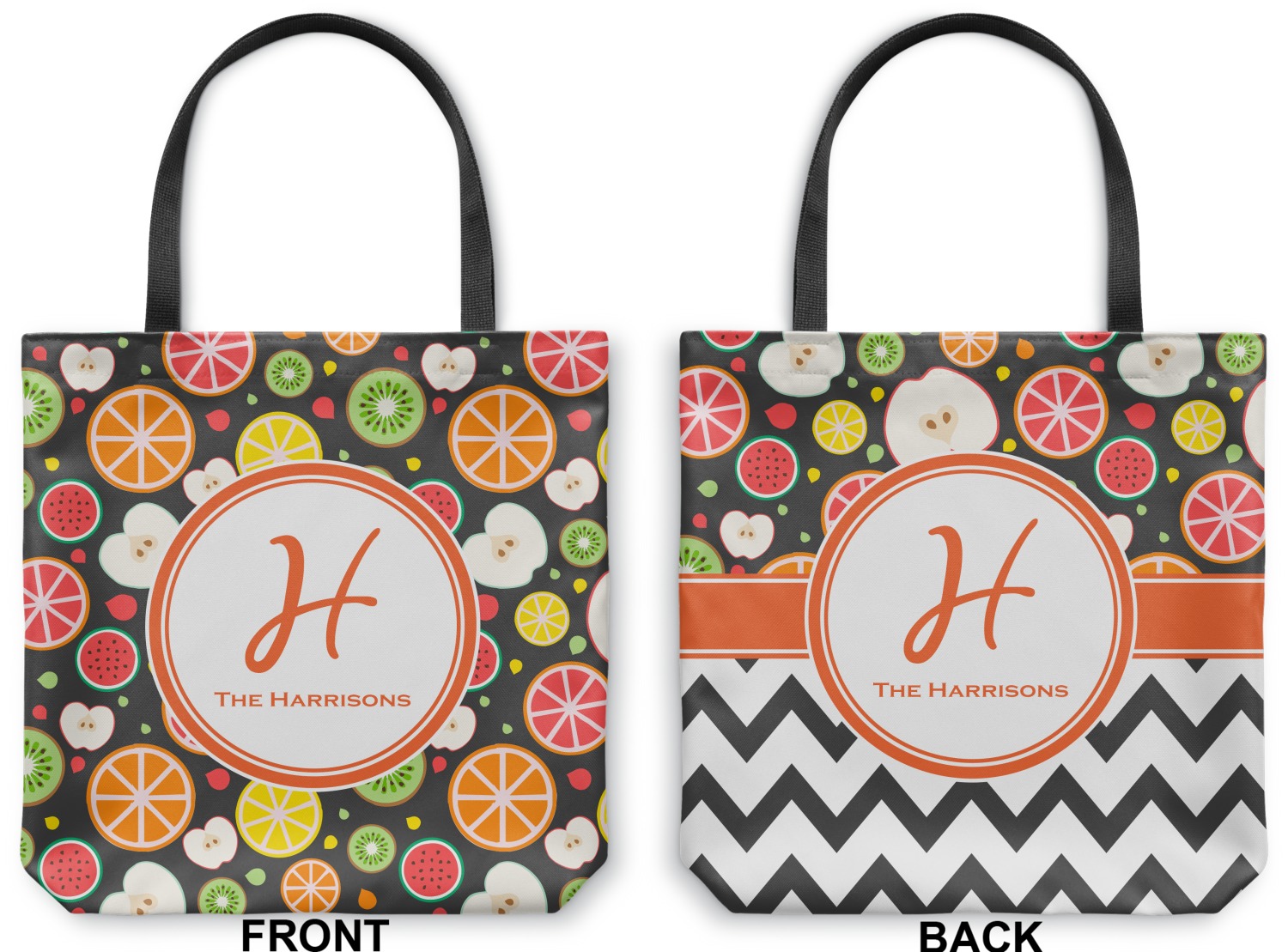 Our totes are made right here in the USA. Your design is printed on canvas fabric; the fabric is then cut and sewn on the sides and on the bottom to add an approximately 3.5 inch gusset. Black cotton handles are sewn in and reinforced. Your tote has a designs on both sides - the designs can be the same or different - the choice is yours. The inside of the tote has a black fused lining.