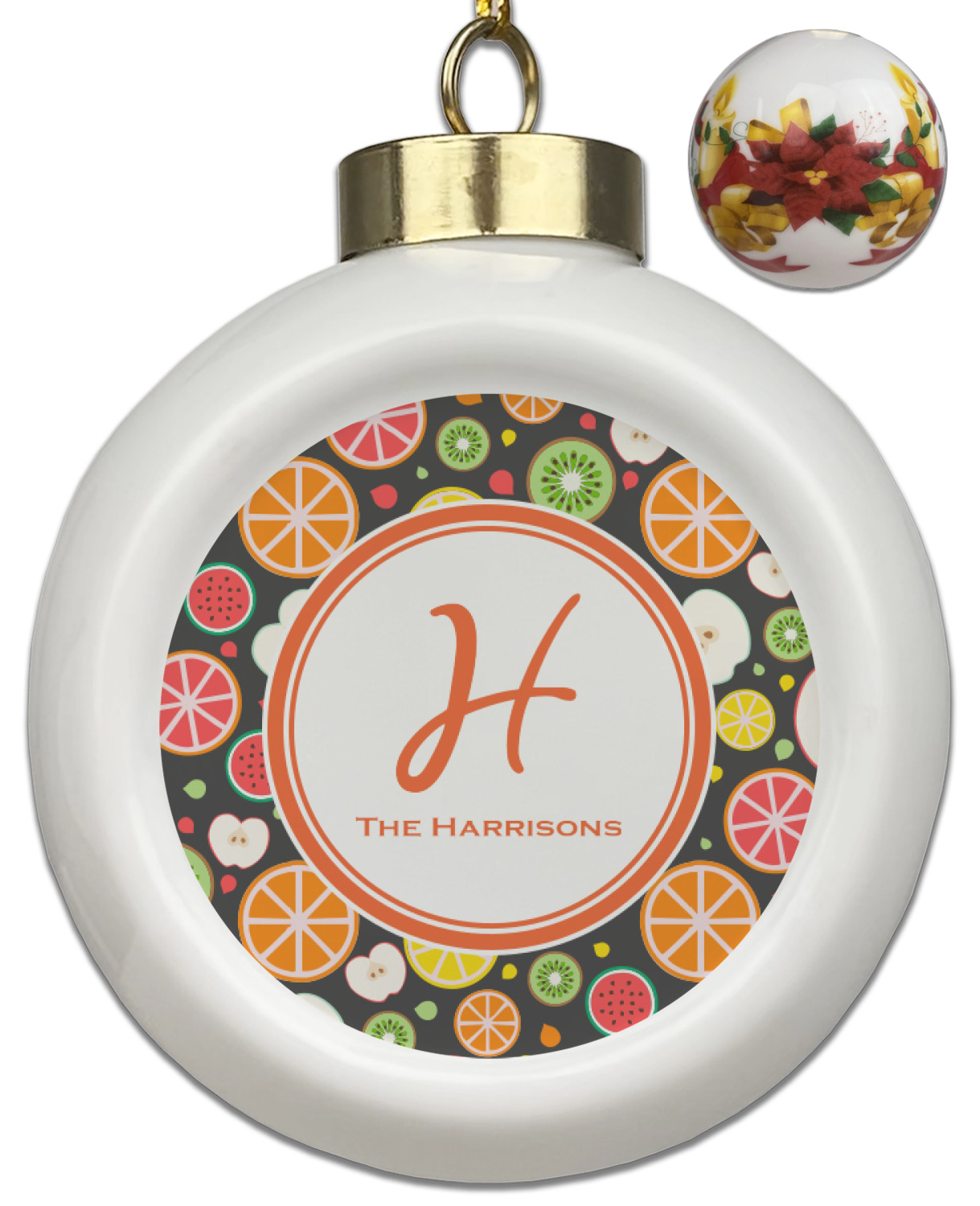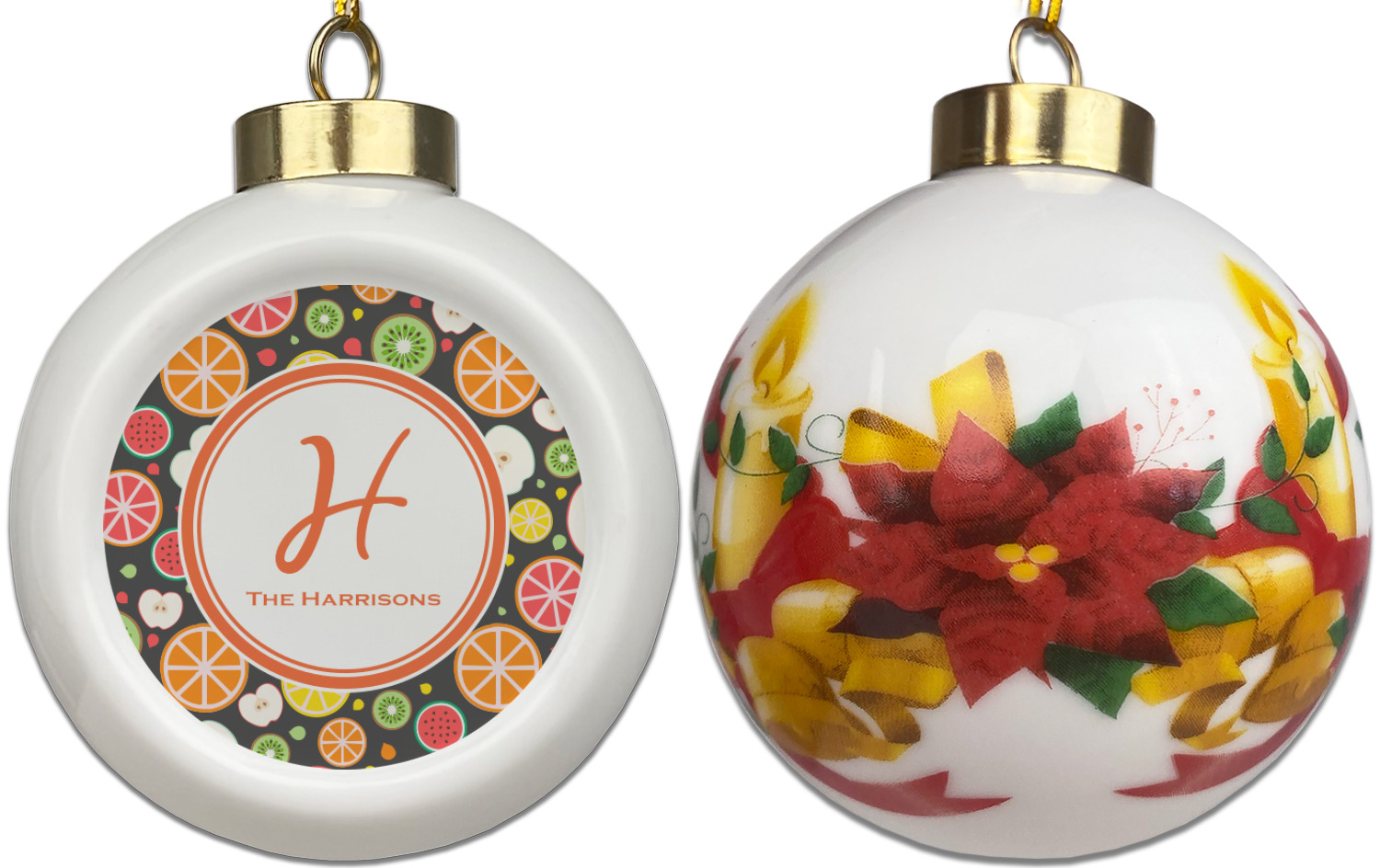 Our Christmas ornaments are a unique ceramic ball shape with a twist as it has a flat face to display your custom design! Select from one of our two design types - Christmas Tree or Poinsettia Garland - to adorn the curved back of your personal design. Each ornament measures 3H x 2.5W x 2D accompanied with a gold string accent for finishing touches to hang on your beautiful Christmas tree!