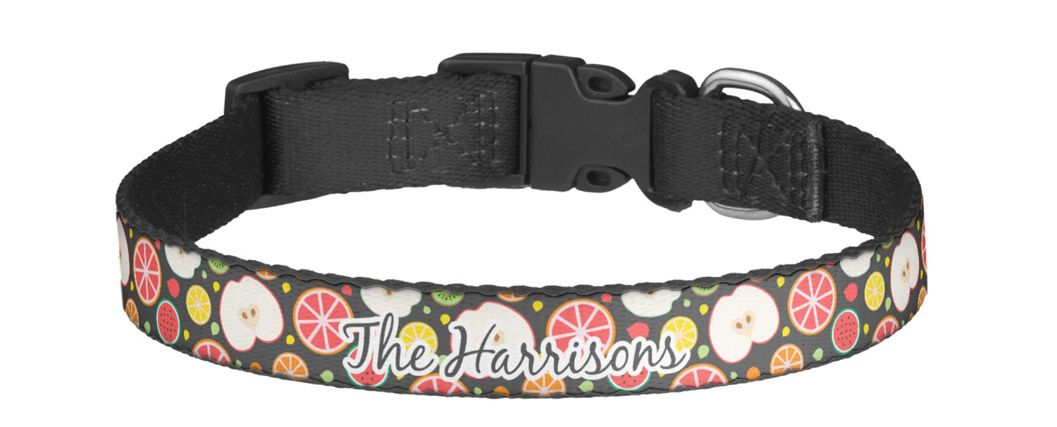 This sturdy collar, made from a durable nylon weave, will outlive your dog's episodes of excited tugging and pulling. Courtesy of its thick plastic buckle and adjuster, this collar is adjustable and accommodating of any dog. Structurally, the collar is a single piece of nylon weave that is sewn together, and features a solid metal loop where you can attach a leash or dog tag. We print and display your dog's name and pattern across the middle of the personalized dog collar.