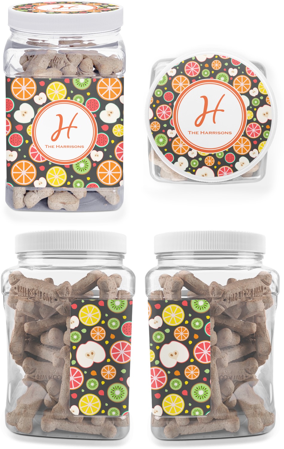 This half gallon jar, made from a sturdy plastic, is the perfect way to keep treats from any naughty pet paws, while still keeping them ready on hand for when your pup performs an impressive trick. This dog cookie jar features a screw-on, white lid that displays your personalized design on a vinyl sticker. We apply another customized sticker that wraps around the front and sides of the jar. Our dog treat jar also has indentations on the rear ends of the sides, which allows for convenient handling, and its square frame allows for easy storage.