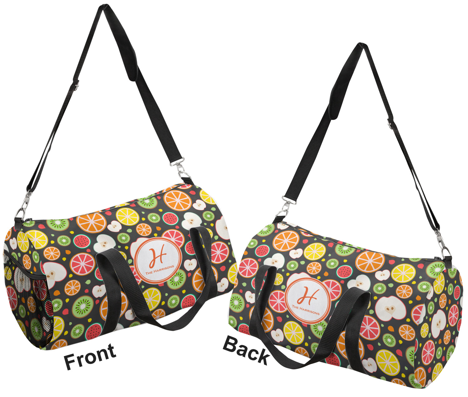 This duffle is a sturdy bag made of a canvas material. It comes in two sizes: Small (19"W x 9.5"H x 9.5"D) and Large (23"W x 12"H x 12"D). The bag is a cylindrical shape with a black adjustable strap and two handles. On one side is an elastic pouch to put a waterbottle or other small item. Your product will be sublimated with your design and is able to be designed on the front, back, and sides. Be sure to remember that the straps may cut into parts of your design if you upload your own artwork.