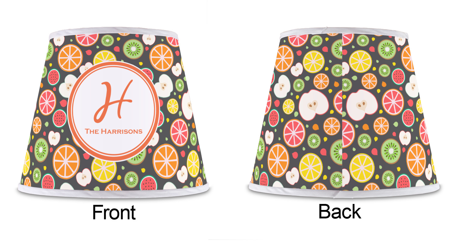 The base of this lampshade is 12 inches in diameter, and the top spans 8 inches in diameter. The total height of the lampshade is 10 inches. The angled nature of this custom lampshade concentrates the light, making it ideal for smaller spaces. This lampshade is made of matte, polyfilm, and displays your customization in its middle. The top and bottom of this colorful lamp shade are lined with a white fabric ribbon (which can be replaced with black inside the design studio) which frames your design and creates a sophisticated finish. As an UNO fitter lampshade, this unique lamp shade will fit a variety of bases.