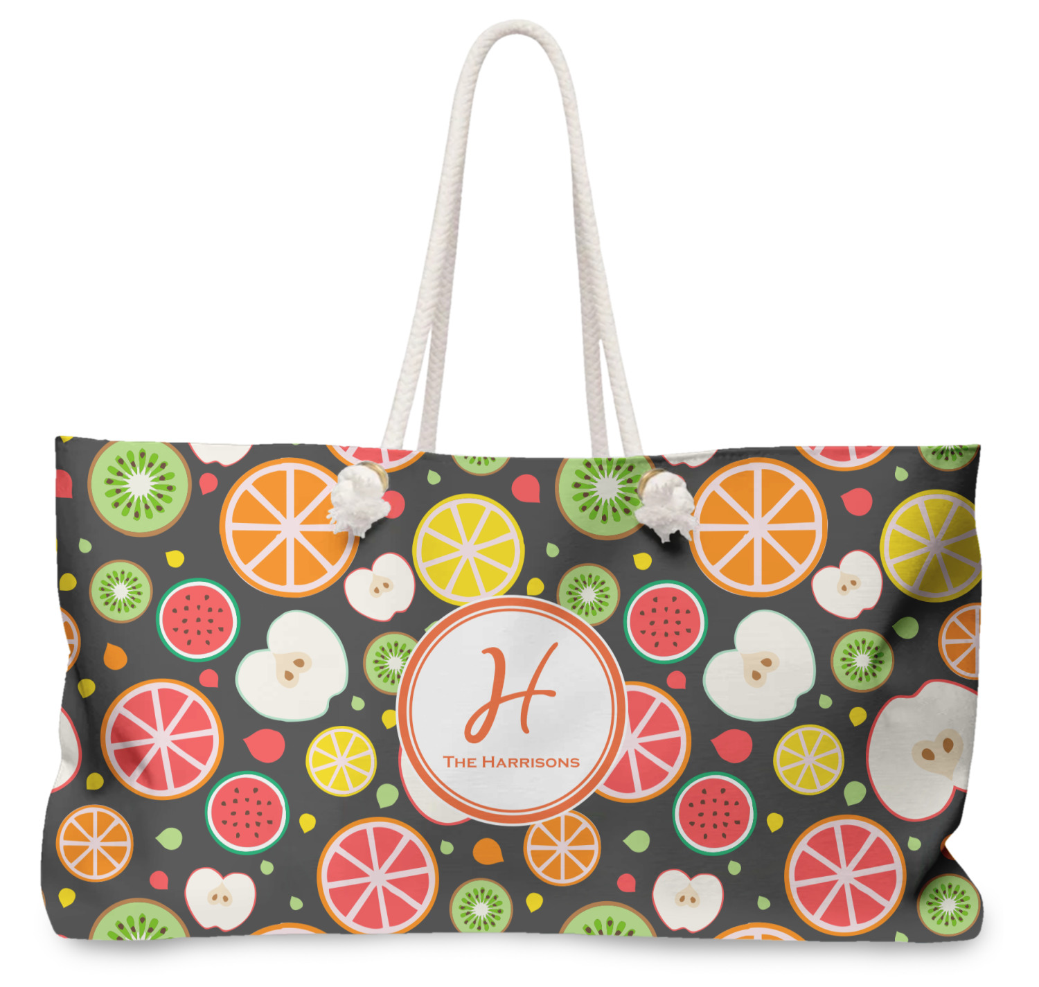 Our oversized weekender tote with rope handles is perfect for your weekend at the beach or on the town. This large tote are 24" W X 13" H, with a 5" gusset and a 27" thick rope handles with a knot that is put through a grommeted brass hole.