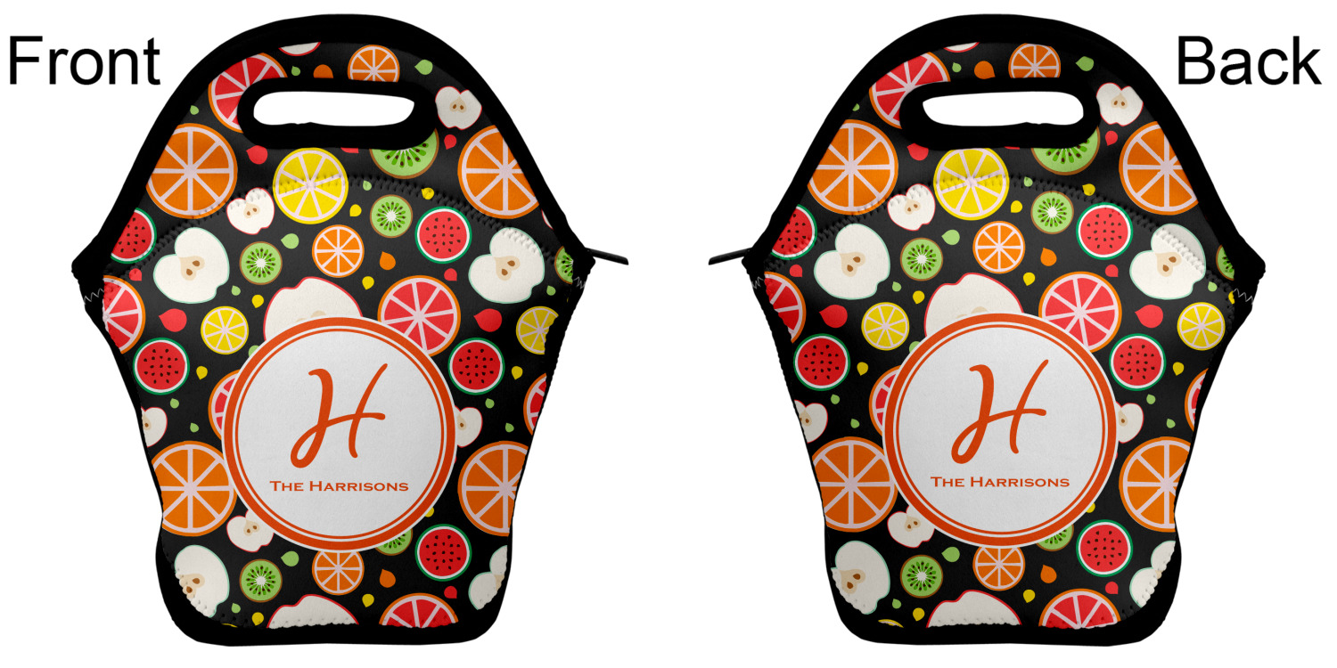 Our personalized lunch bags are made from a strong neoprene, and secure with a zipper closure that lines the top of the bag.The edges of the neoprene are sewn together with a heavy duty stitch, adding to the durability of the bag. The is accompanied by a reinforced handle at its top, for the easy transport of your lunch. We display your personalization across both the front and back of this neoprene lunch bag, while the remaining sides are a sleek black in color. Each bag measures at 13.5 inches tall, and 11.5 inches wide.