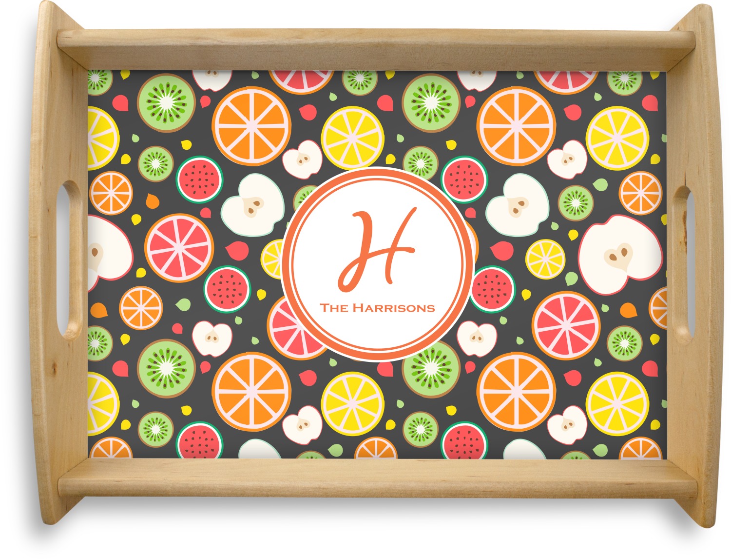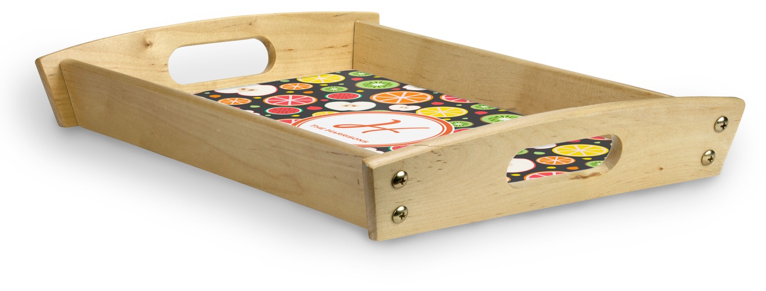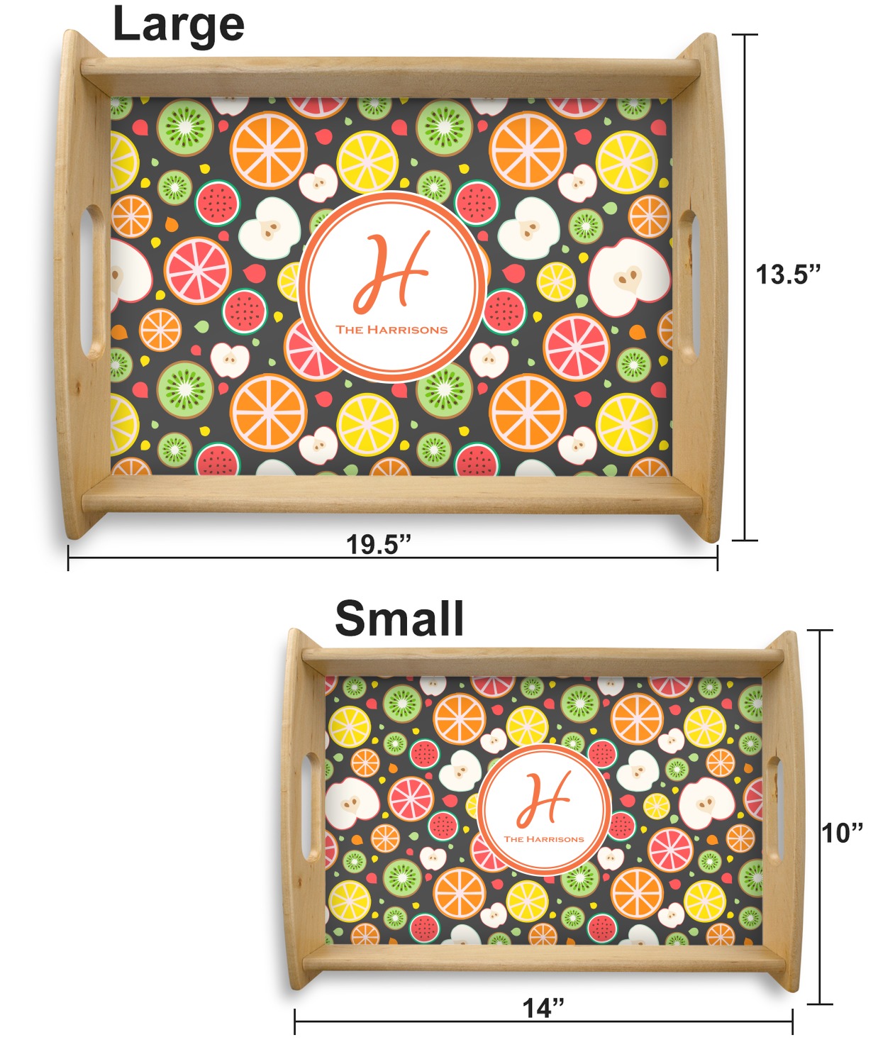This serving tray with handles features square edges and two rounded sides, creating a very modern look. Each side is fabricated from a beautifully cut, natural wood. The bottom of the interior of the tray displays your customized design in bright, vibrant color. The tray is sold in both a black color and a natural wood look. Each variation of the wood serving tray has two sizes: Small, which is 14" x 10" x 2.25", and Large, which is 19.5" x 13.5" x 2.75".