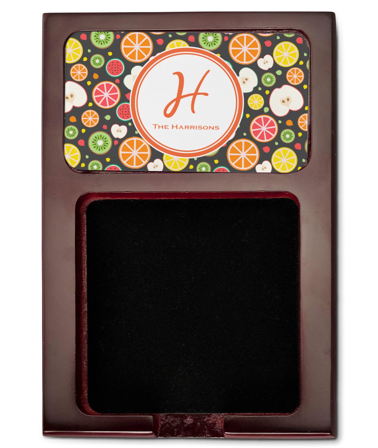 Crafted from a fine mahogany, this post it note holder is in the shade of a dark, cherry color. The dispenser itself is about 4.25 by 6.25 by 0.75 inches. You can place your 3 by 3 inch sticky notes in the indentation below the nameplate. We print your customization onto the nameplate that rests above the velvety indentation.