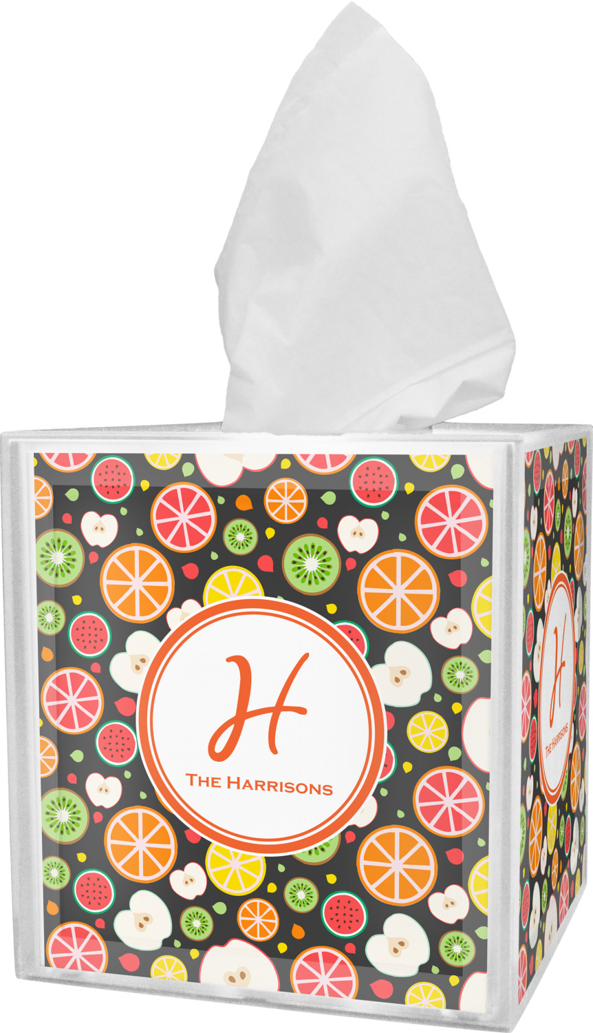 These tissue holders are built from durable acrylic and display your unique personalization on fine-quality vinyl inserts placed within the four sides and top. The box features two pieces, allowing you to easily switch out tissue boxes. On the sides, youll find ridges that ensure the top and base fit securely in place. The bottom of these tissue box holders has four, rubber, non-slip pads to prevent the box from scuffing any surface you decide to display it on. Each box can fit a standard 5 by 5-inch box of tissues.