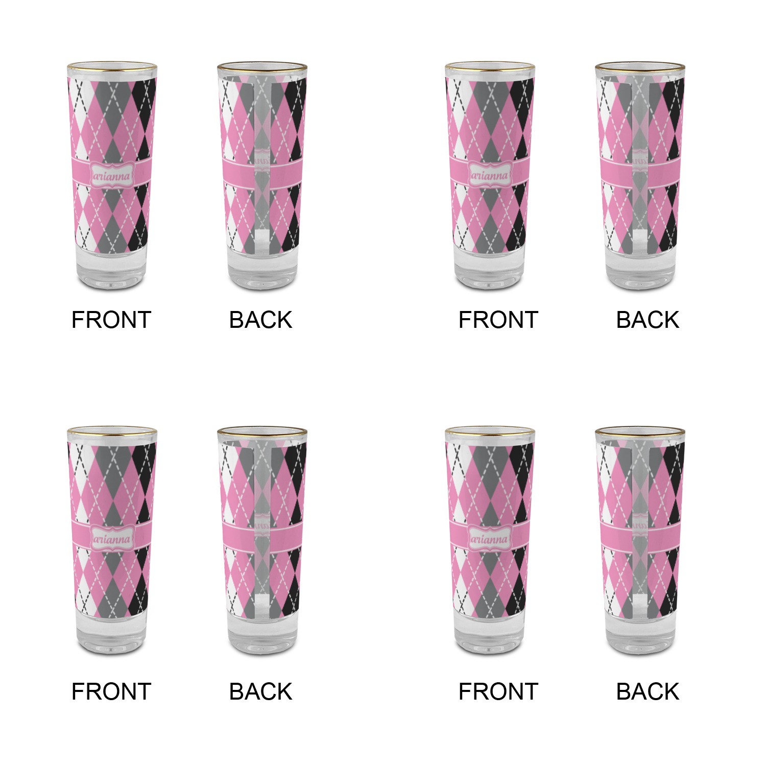 These glass shooter glasses are printed in full color with the design of your choice. These are a tall shooter 2 oz size and stand 4" tall. The print is a full wrap design to boldly display your personalization.