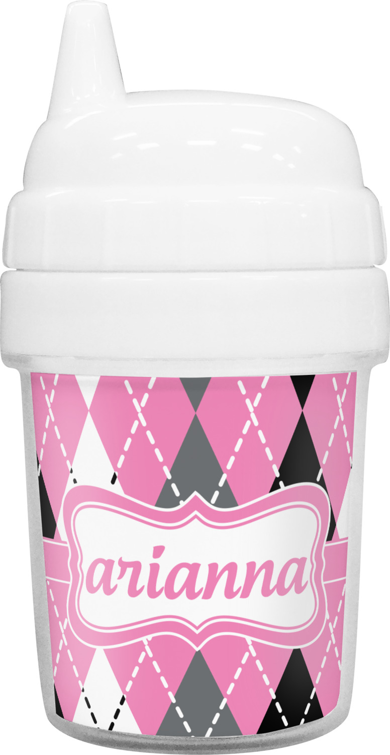 Our toddler cups are free of BPA, and have a twist-open lid so that you can easily fill and clean these cups for your young ones. Each cup also comes with a sippy nozzle to reduce spills. We offer these custom sippy cups in two different sizes; we have a baby sippy cup that holds 5 ounces, and a toddler sippy cup that holds 10 ounces. Your customization is printed on a premium glossy media insert that is placed within these toddler drinking cups.