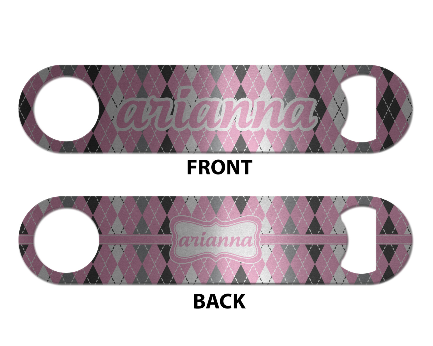 Made from stainless steel, these beer bottle openers are 7 by 1.625 inches, giving you plenty of leverage when trying to open a stubborn bottle. On one end of this personalized bottle opener, you'll find a circular hole for you to hang and display your opener. On the opposite end, you'll find the tool used for opening bottles. This opener in particular has the same structure and style as professional bartender bottle openers. Your customization is sublimated onto both the back and front, and both sides can be customized individually. Choose from one of our two base colors - white or silver.