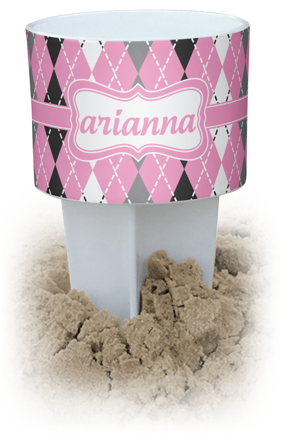 This cup holder has a large stake at its bottom that anchors it to the sand or ground below, while the cup holder rests above the stake. The entire drink holder is made of durable plastic and displays your customization around the cup holder portion. We sell these personalized beach spikers in two different colors: black and white.