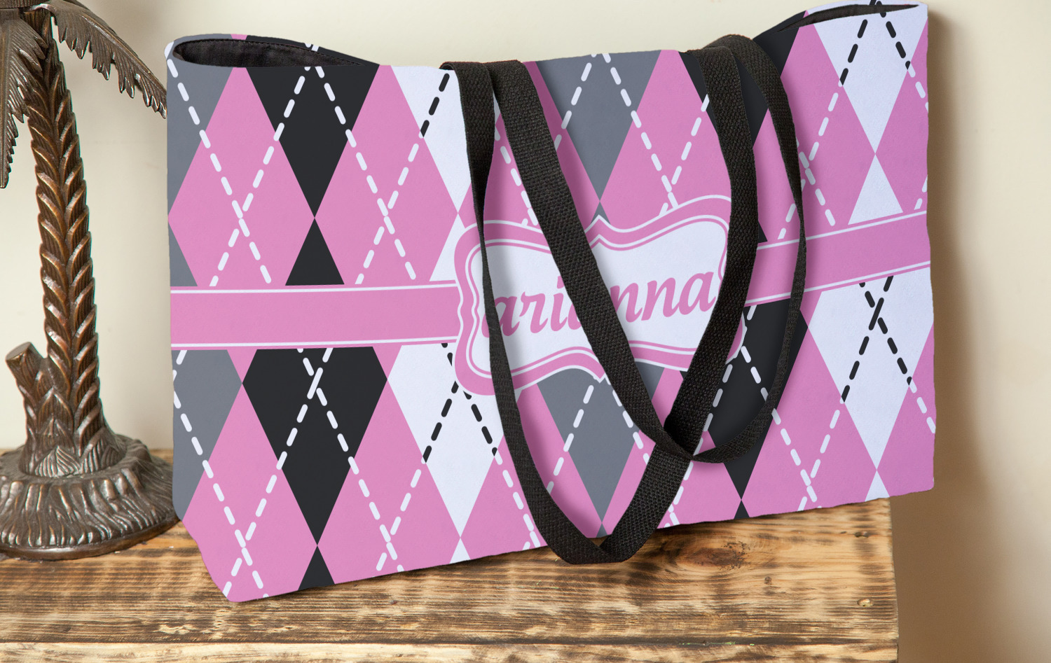 These beach totes are handmade here in the USA. Fabric is printed with your design. The tote is then sewn from the fabric pieces, lining and handles added.