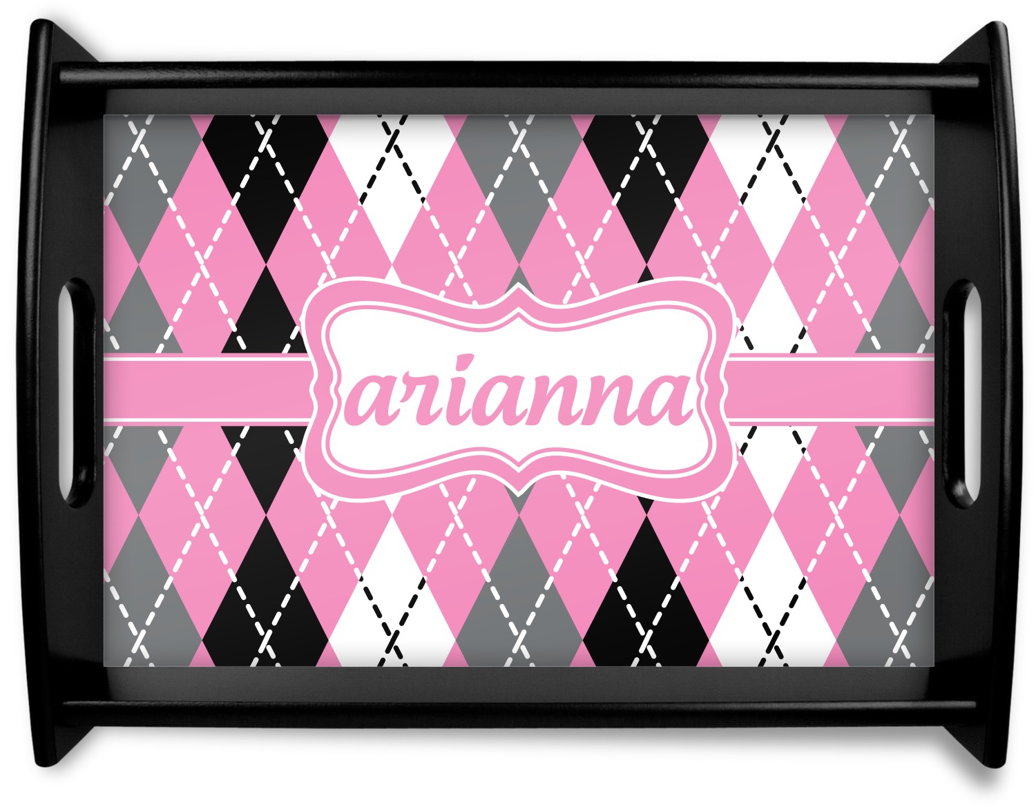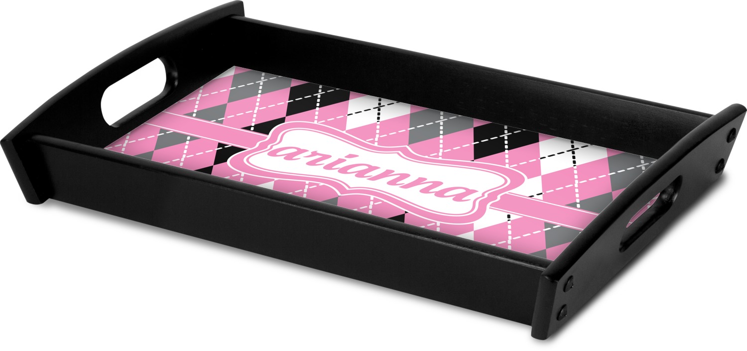This serving tray with handles features square edges and two rounded sides, creating a very modern look. Each side is fabricated from a beautifully cut, natural wood. The bottom of the interior of the tray displays your customized design in bright, vibrant color. The tray is sold in both a black color and a natural wood look. Each variation of the wood serving tray has two sizes: Small, which is 14" x 10" x 2.25", and Large, which is 19.5" x 13.5" x 2.75".