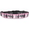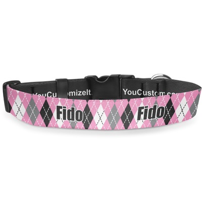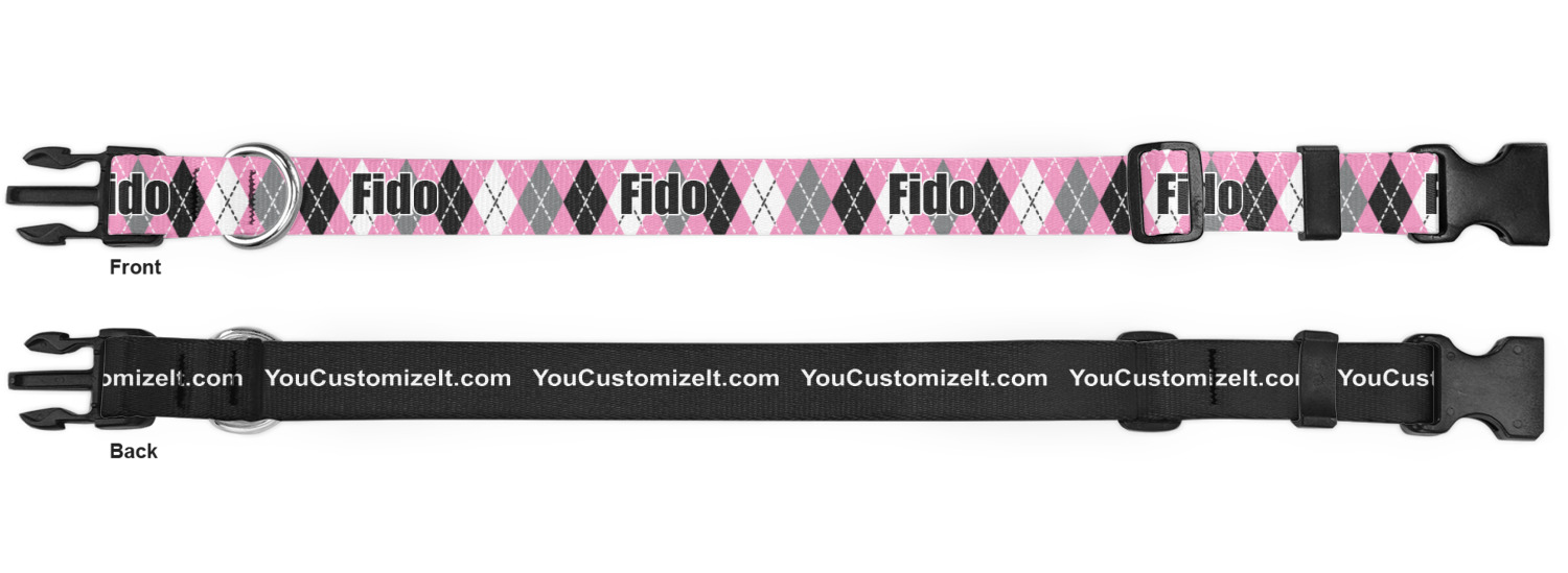 This sturdy collar, made from a durable nylon weave, will outlive your dog's episodes of excited tugging and pulling. Courtesy of its thick plastic buckle and adjuster, this collar is adjustable and accommodating of any dog. Structurally, the collar is a single piece of nylon weave that is sewn together, and features a solid metal loop where you can attach a leash or dog tag. We print and display your dog's name and pattern across the middle of the personalized dog collar.