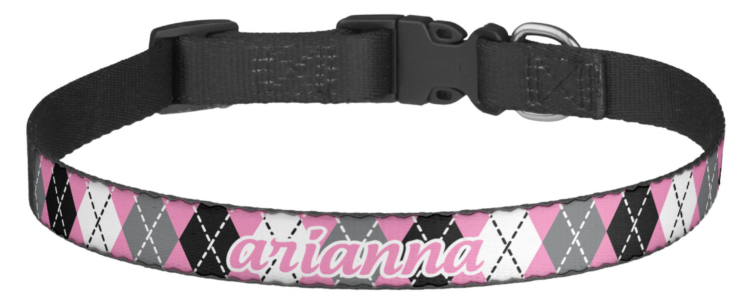 This sturdy collar, made from a durable nylon weave, will outlive your dog's episodes of excited tugging and pulling. Courtesy of its thick plastic buckle and adjuster, this collar is adjustable and accommodating of any dog. Structurally, the collar is a single piece of nylon weave that is sewn together, and features a solid metal loop where you can attach a leash or dog tag. We print and display your dog's name and pattern across the middle of the personalized dog collar.
