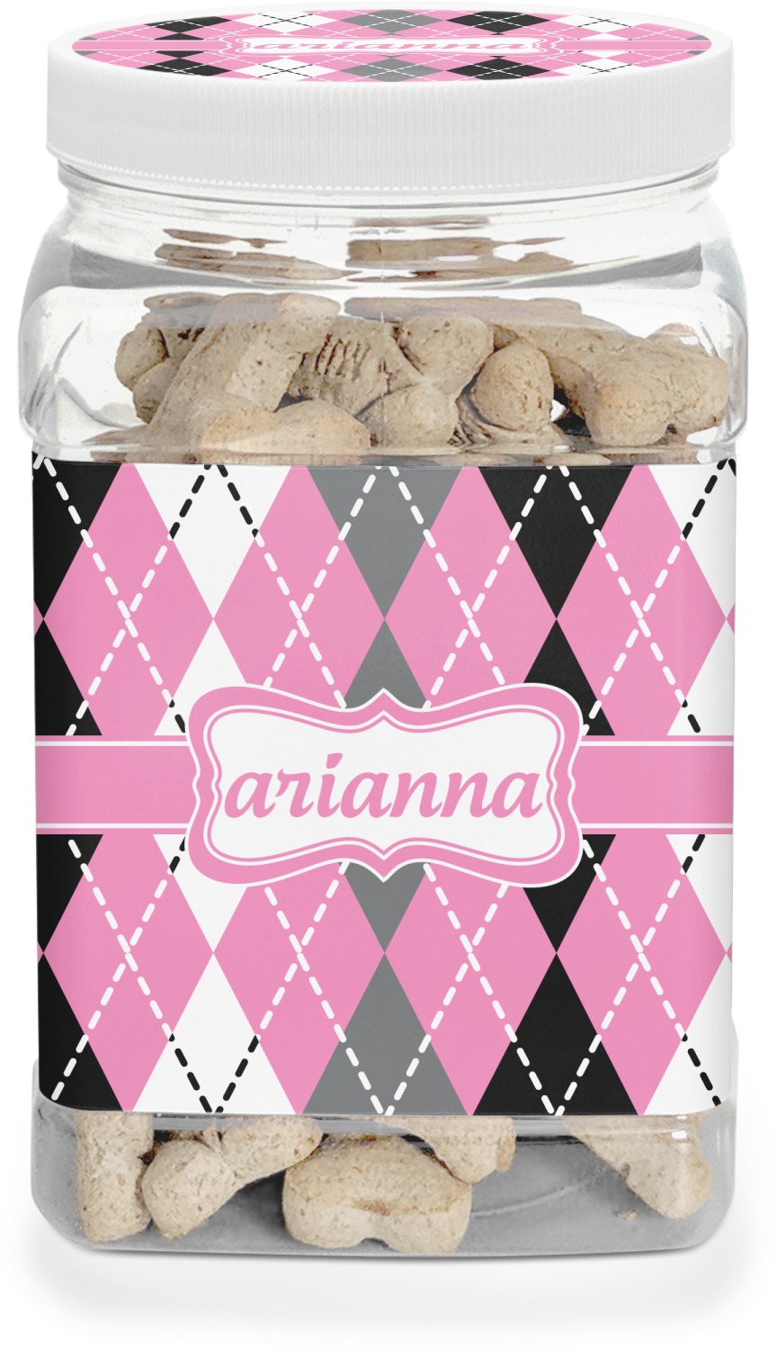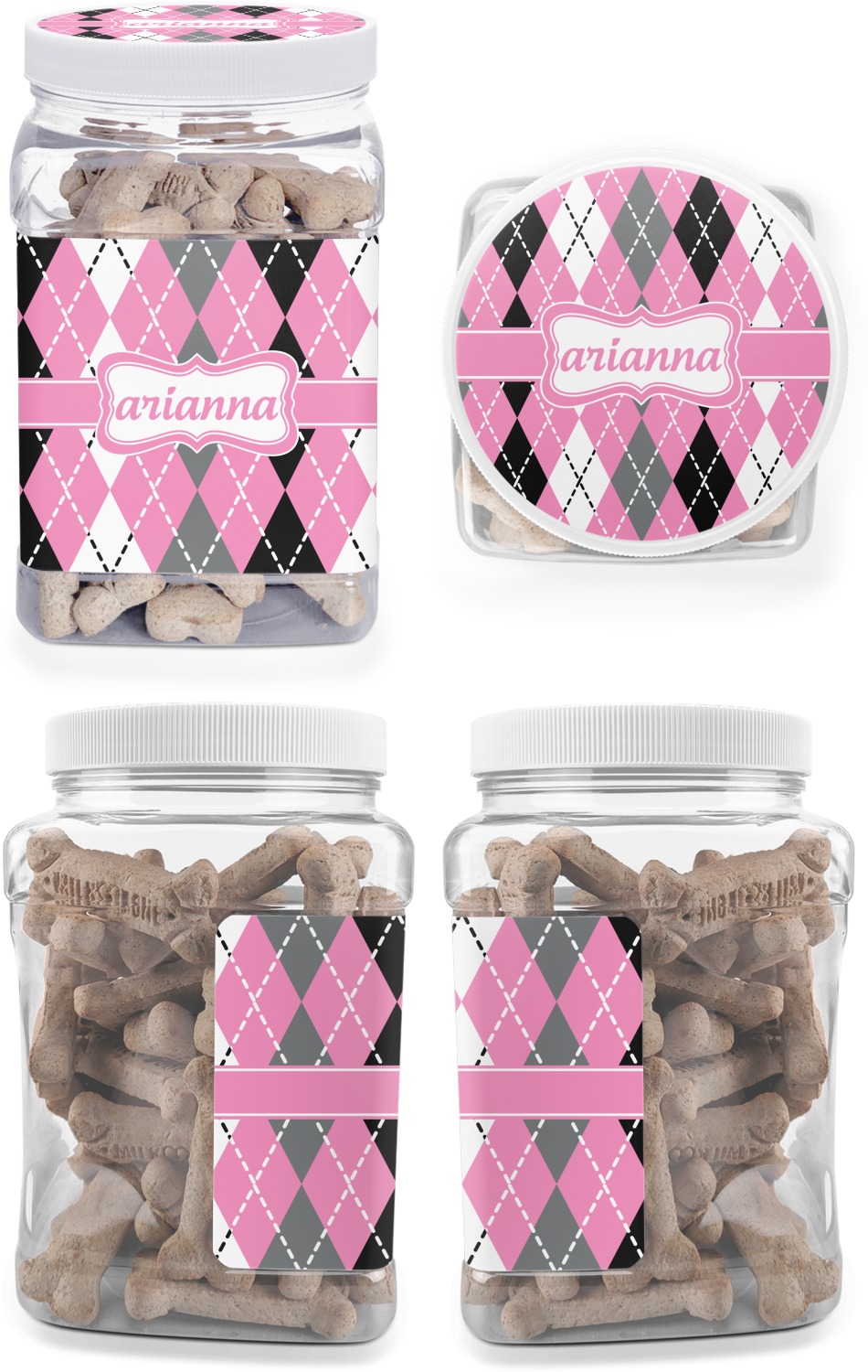 This half gallon jar, made from a sturdy plastic, is the perfect way to keep treats from any naughty pet paws, while still keeping them ready on hand for when your pup performs an impressive trick. This dog cookie jar features a screw-on, white lid that displays your personalized design on a vinyl sticker. We apply another customized sticker that wraps around the front and sides of the jar. Our dog treat jar also has indentations on the rear ends of the sides, which allows for convenient handling, and its square frame allows for easy storage.