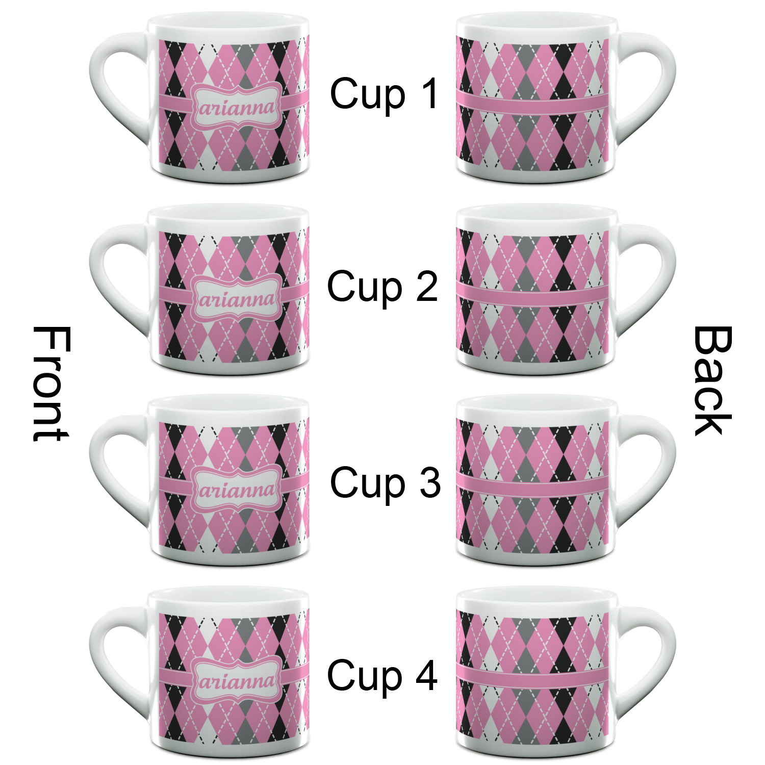 Each of our espresso mugs is a ceramic material sure to keep your drink warm. Personalize one cup for yourself, or order a set of 4! Its the perfect little gift for any coffee lover! We carry two sizes for you to personalize - 3 oz. (approx. 3.25" x 2.325" x 2.625") or 6 oz. (approx. 4" x 2.9" x 2.9"). Our 3 oz. mug is perfect for that single shot espresso while our 6 oz. mug can be your next favorite cappuccino cup holding two shots of espresso!