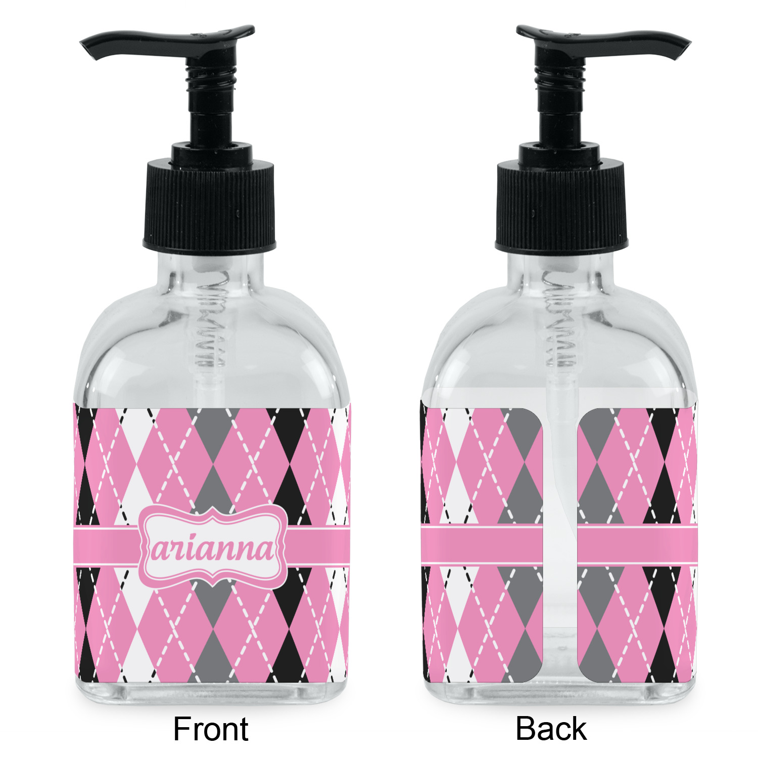 Crafted from a high-quality glass, these soap dispensers and lotion dispensers are durable and robust, while still looking elegant. They are sold with black pumps. Each soap dispenser pump measures at 6.5 by 2.25 inches. On these soap pumps, we display your customized design on a personalized vinyl adhesive on three sides. That way, you can judge how much liquid is in the bottles from the back.