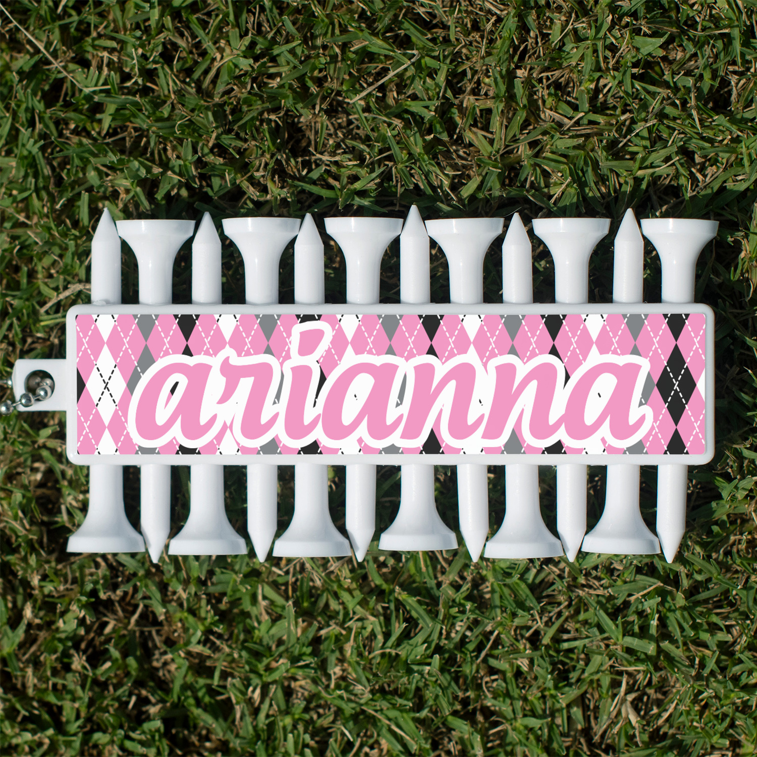 With 12 tees on a lightweight, portable key chain, it almost ensures a great 18 holes. Our tees are made of white plastic and are a little over 2". Design the front and the back of the golf tee holder. Pick from over a hundred designs, colors, and personalization styles! The set even comes with three removable ball markers as well!