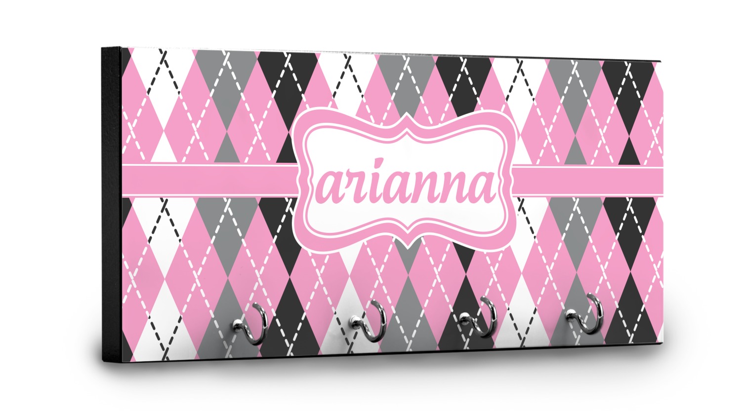This 11" x 5" key hanger is made of sturdy wood and has four metal hooks lining the bottom. This is the perfect size for a family with several drivers. Not only can you hang keys on it though, but pet leashes and other small items. The board is black on the sides and back and is printed with the design of your choice on the front.