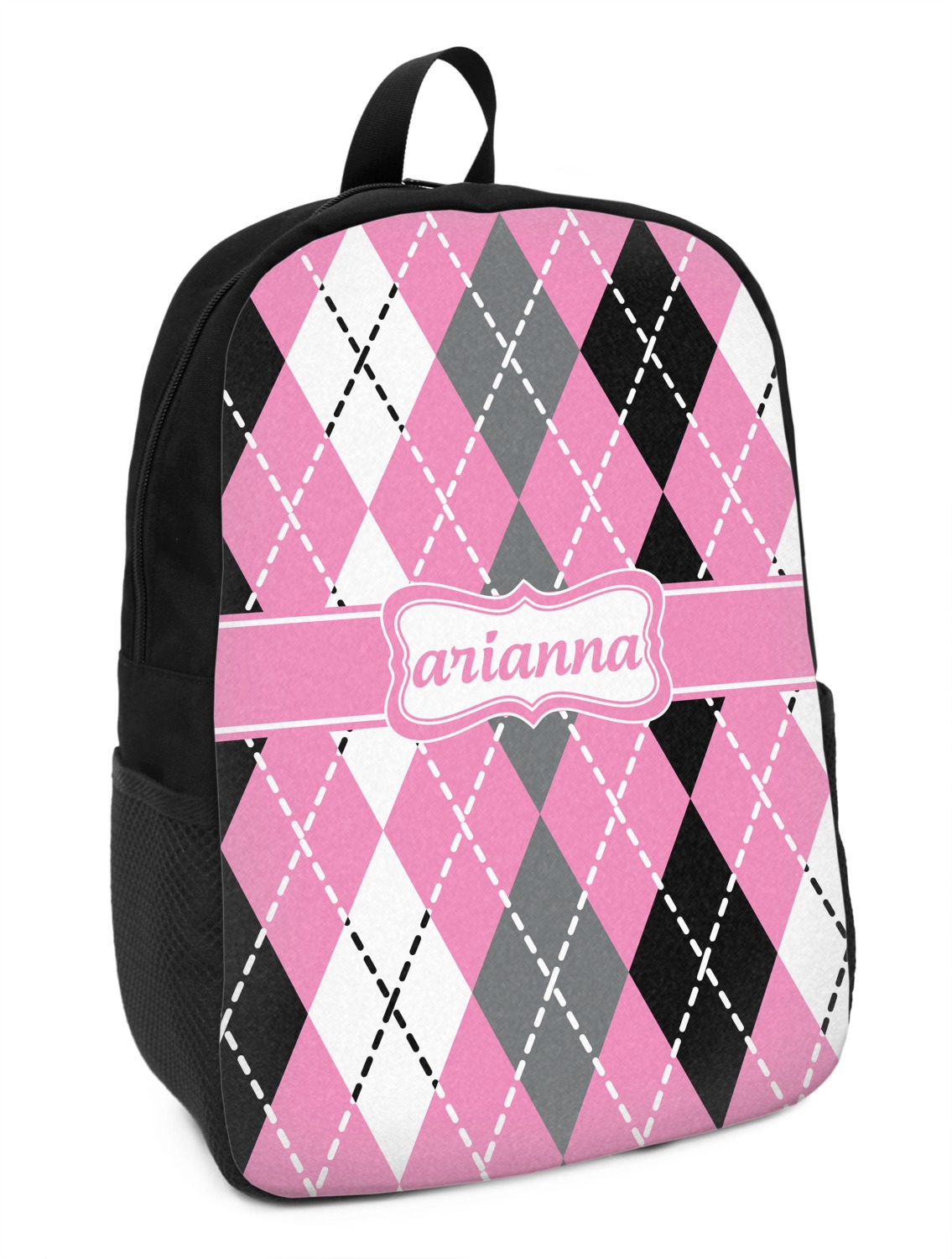 These small backpacks are made of a durable black canvas material with your personalization right on the front. The two shoulder straps are padded and easily adjustable. The bag itself measures at about 11" W x 15" H x 5" D. It's the perfect size for elementary aged kids or adults who want a smaller backpack. On the top of the bag you will find a handle to hang or carry your backpack by as well as a large zipper closure to keep all of your belongings safe inside. On each side of your backpack is a mesh pocket for a small item or water bottle. Inside your backpack you will find a spacious area with a small zipper pocket and a padded laptop slot that will fit up to a 13" laptop (13" being very snug). This is the perfect bag for any student that needs a couple books and their laptop with them at all times. It also works great as a carry on for traveling!