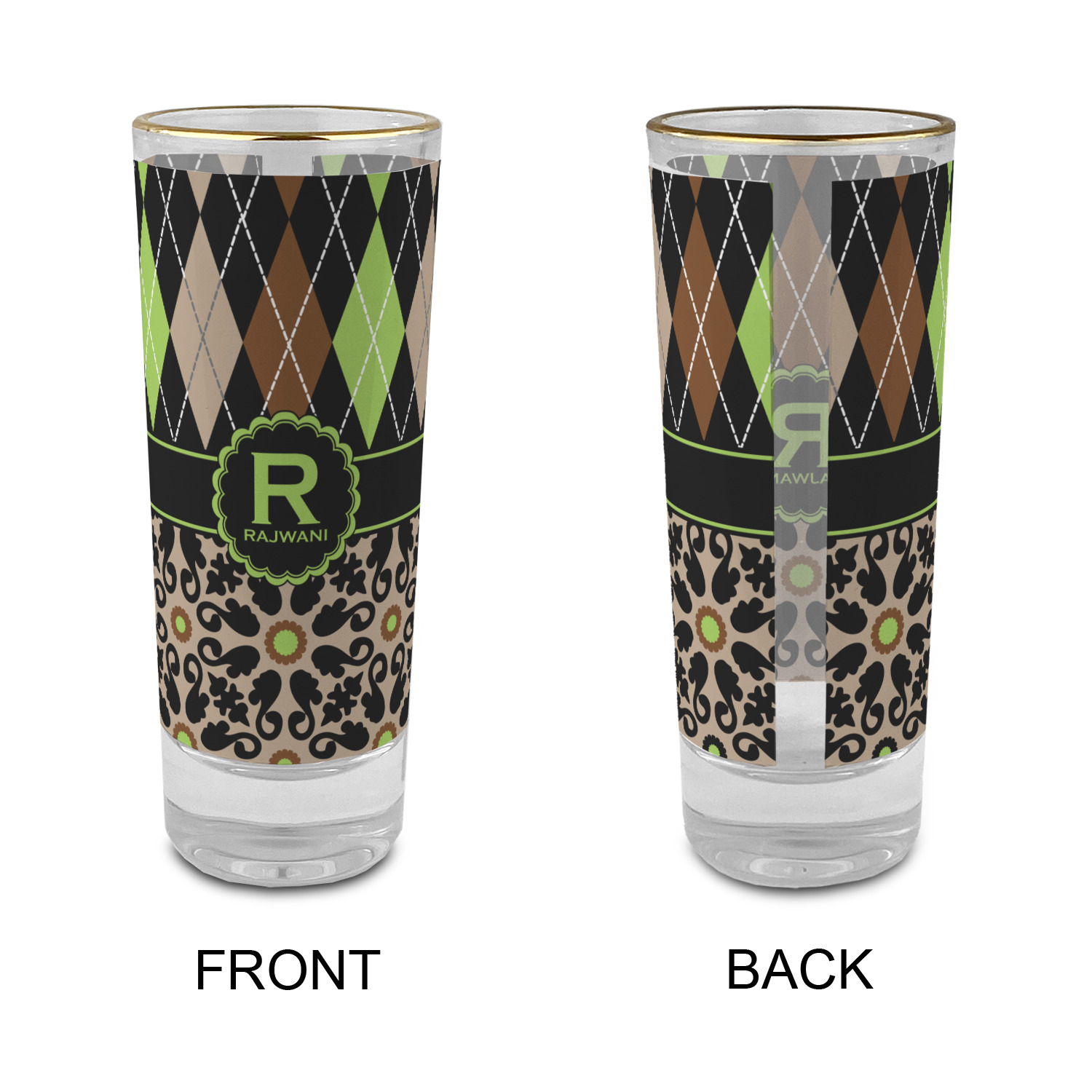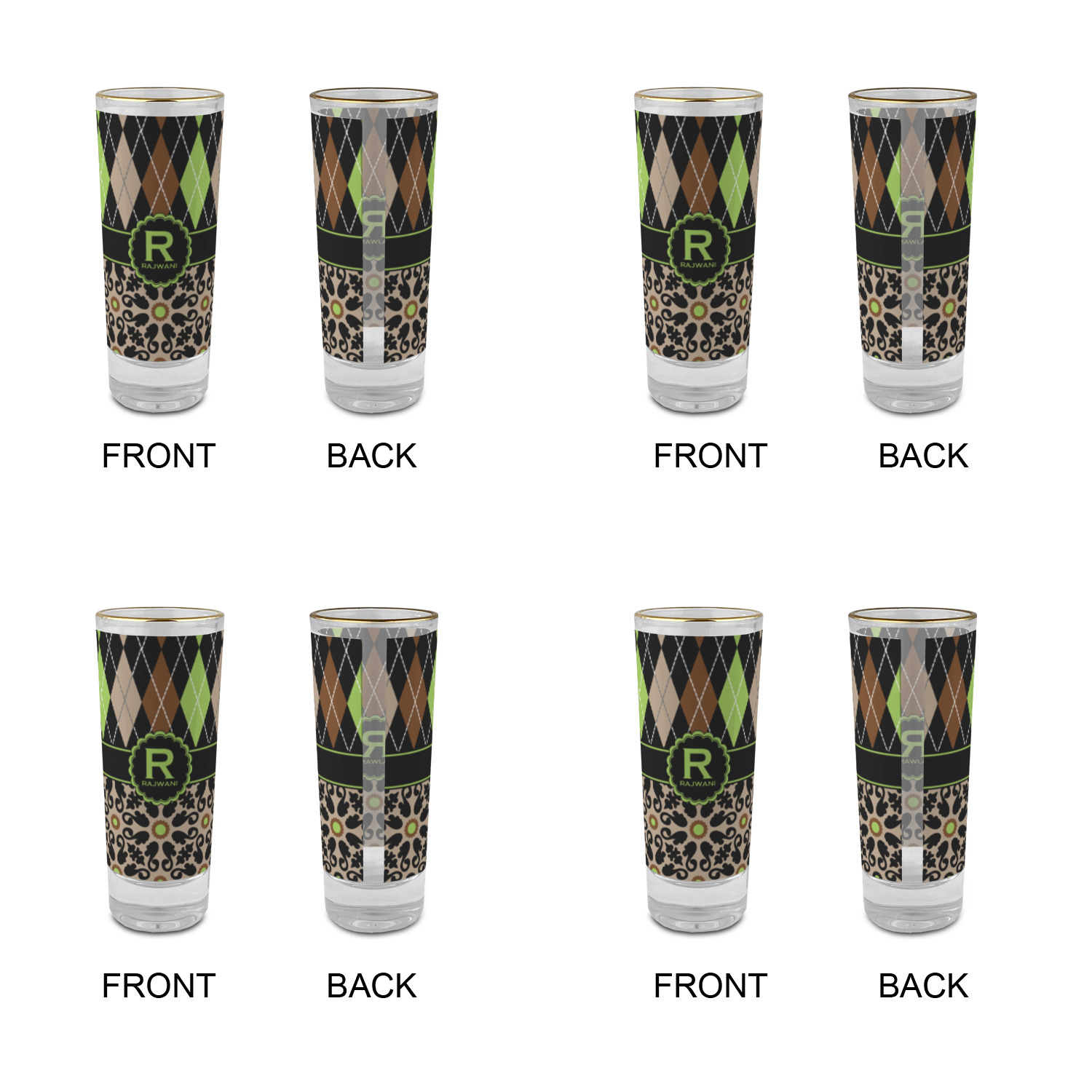 These glass shooter glasses are printed in full color with the design of your choice. These are a tall shooter 2 oz size and stand 4" tall. The print is a full wrap design to boldly display your personalization.