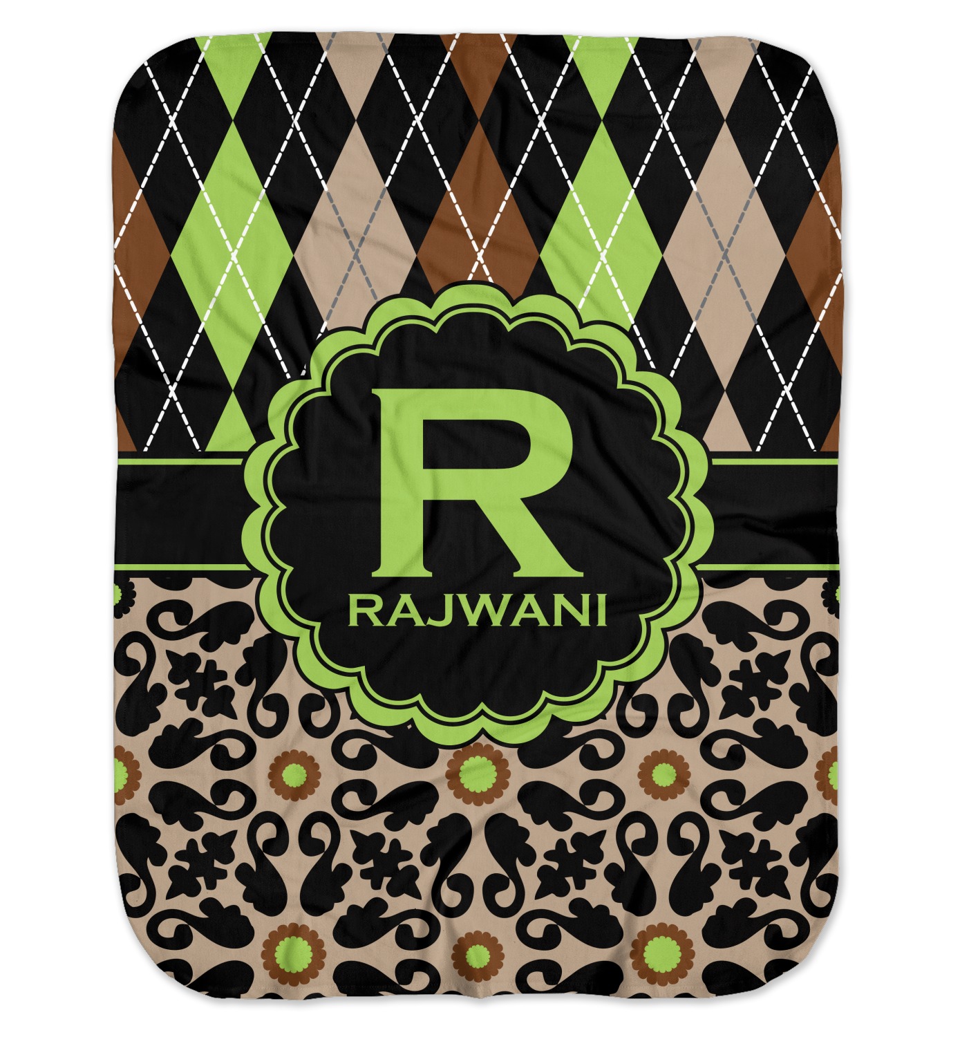 Feminine and masculine collide with this gorgeous design. The top of the design is a contrasting harlequin print in the colors of black, brown, tan, and lime green. The bottom of the design offers a fun girly flair in an abstract pattern in the same colors as the harlequin pattern set against a tan background to create a floral pattern