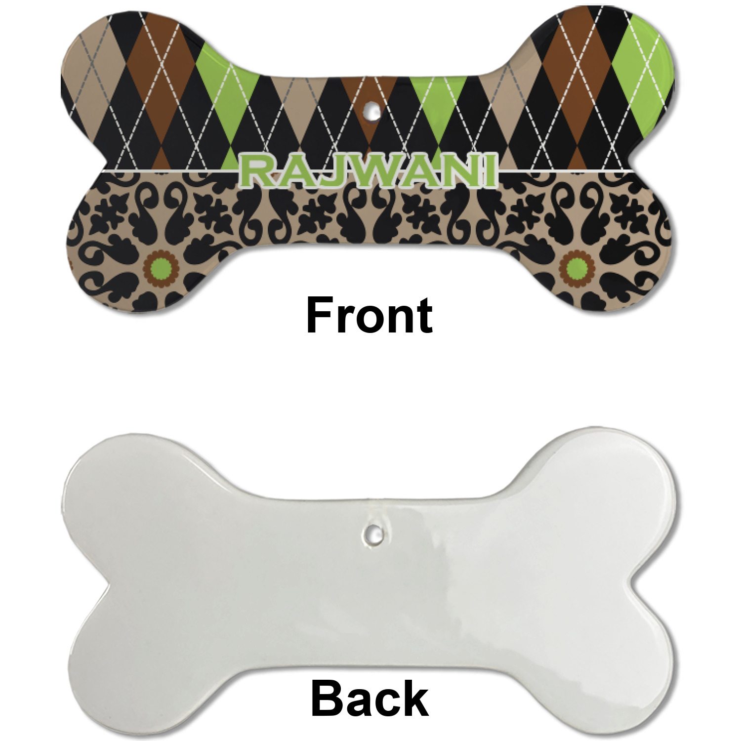 Our dog Christmas ornaments are a ceramic material with a bone-shaped structure hung horizontally. We offer two printing styles to personalize your furry friend's ornament! Choose a one-sided printing, perfect for wall decor, memorial accessory, or doghouse nameplate! Create a double-sided ornament perfect for adorning the Christmas tree. Each dog bone ornament is approximately 4.75" x 2.25" and is printed here in the USA.