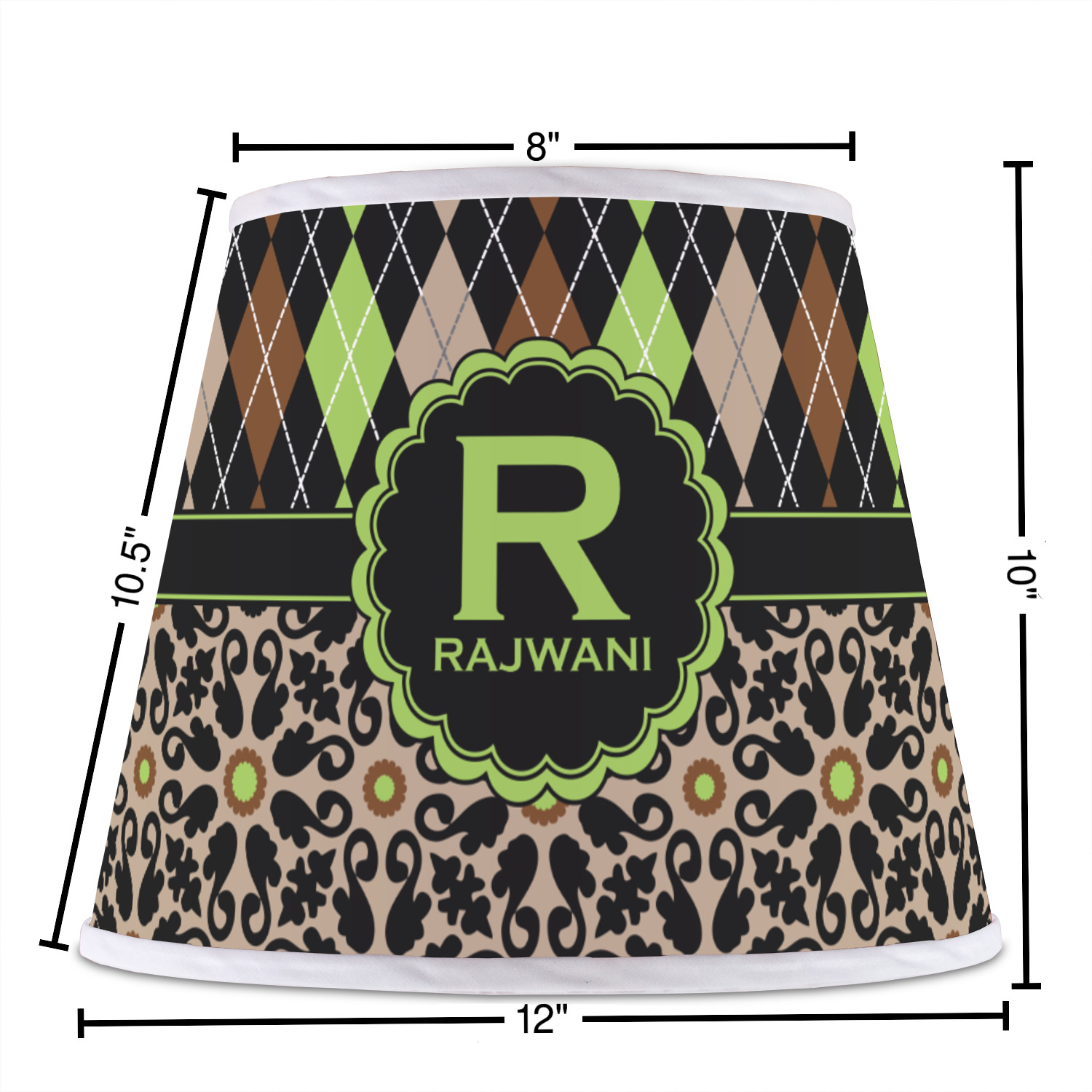 The base of this lampshade is 12 inches in diameter, and the top spans 8 inches in diameter. The total height of the lampshade is 10 inches. The angled nature of this custom lampshade concentrates the light, making it ideal for smaller spaces. This lampshade is made of matte, polyfilm, and displays your customization in its middle. The top and bottom of this colorful lamp shade are lined with a white fabric ribbon (which can be replaced with black inside the design studio) which frames your design and creates a sophisticated finish. As an UNO fitter lampshade, this unique lamp shade will fit a variety of bases.