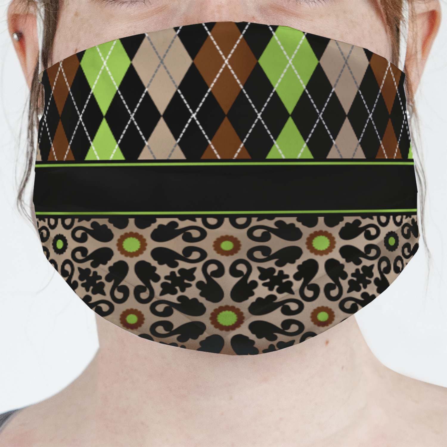 Feminine and masculine collide with this gorgeous design. The top of the design is a contrasting harlequin print in the colors of black, brown, tan, and lime green. The bottom of the design offers a fun girly flair in an abstract pattern in the same colors as the harlequin pattern set against a tan background to create a floral pattern