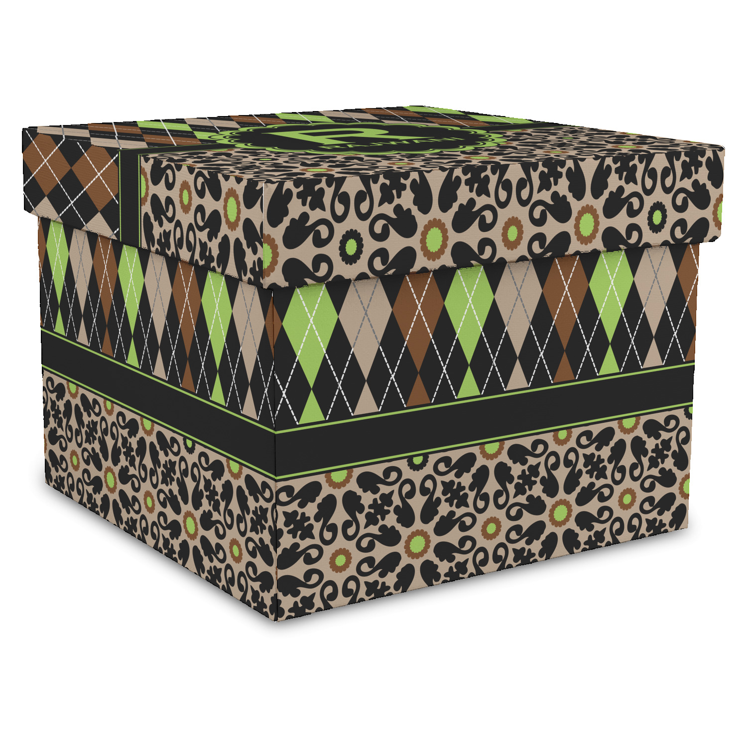 Feminine and masculine collide with this gorgeous design. The top of the design is a contrasting harlequin print in the colors of black, brown, tan, and lime green. The bottom of the design offers a fun girly flair in an abstract pattern in the same colors as the harlequin pattern set against a tan background to create a floral pattern