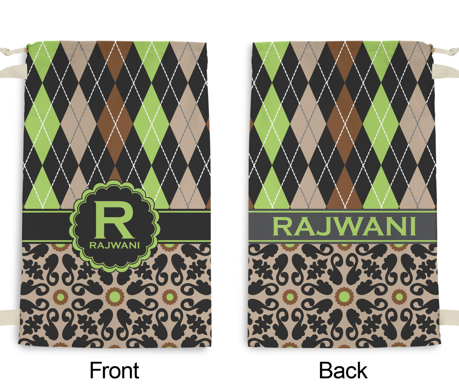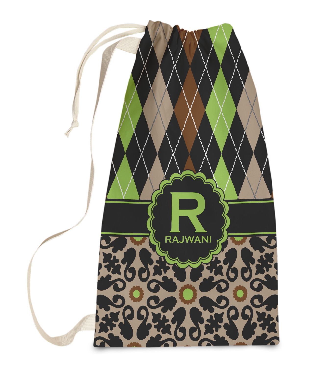 Carry your laundry in style with these customized laundry bags. Available in two sizes, featuring a natural colored woven strap and a cinch cord, these bags hold a lot of clothes or anything else you want to fit in them.