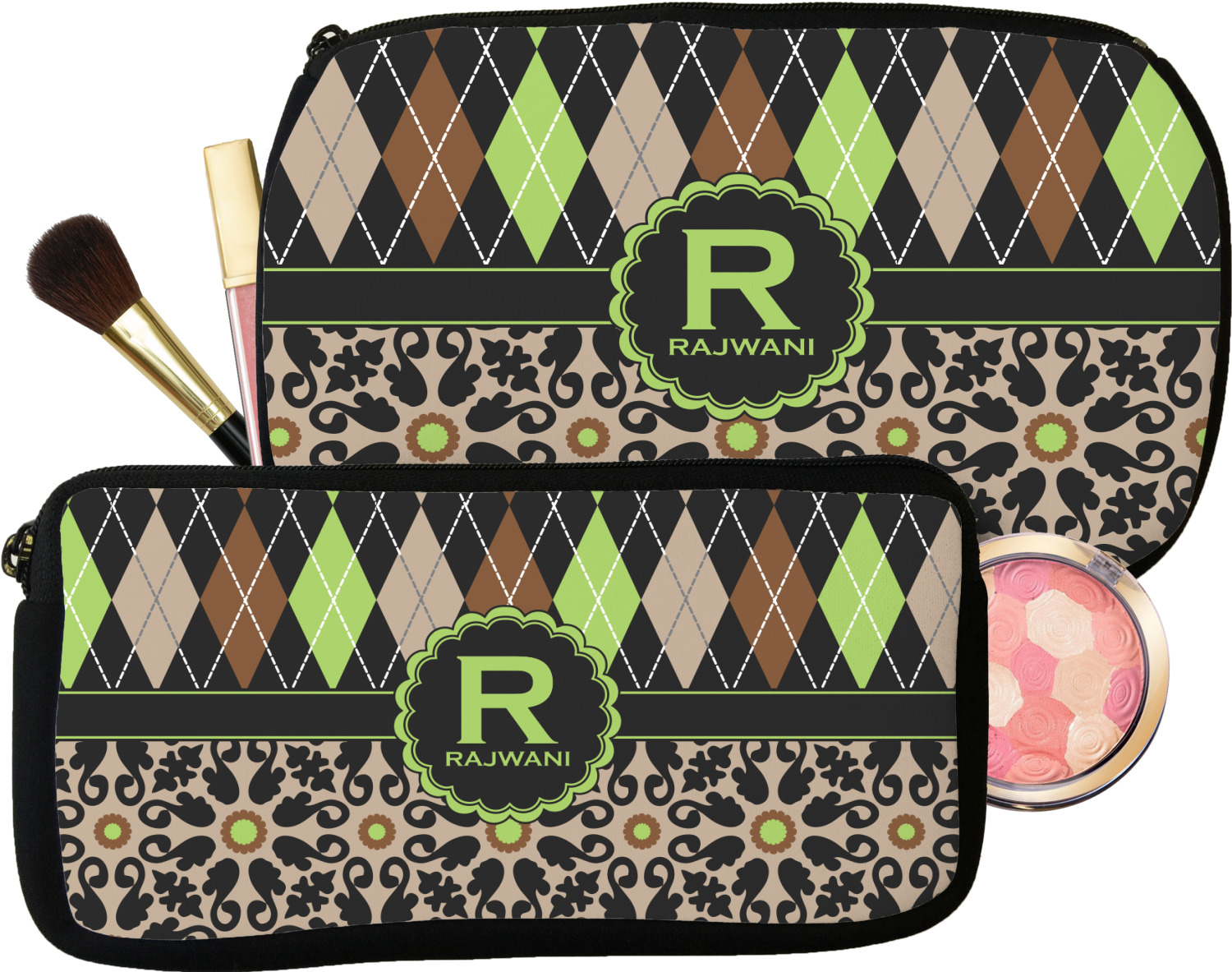 Our personalized makeup bags are available in many different designs, patterns and colors - so you are sure to find one that will love. They are made of neoprene (same material as wet-suits) and thus are water resistant, so spillages in your makeup bag will not end up all over you purse. They are customized on one side and are black on the other side and the zipper is black as well.