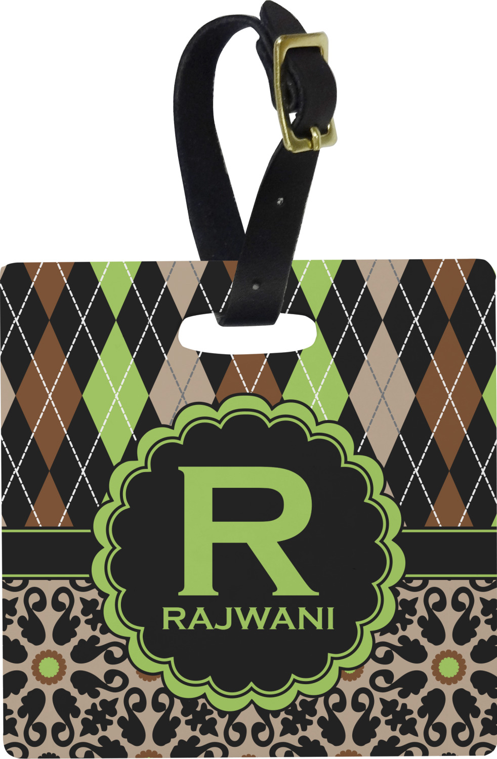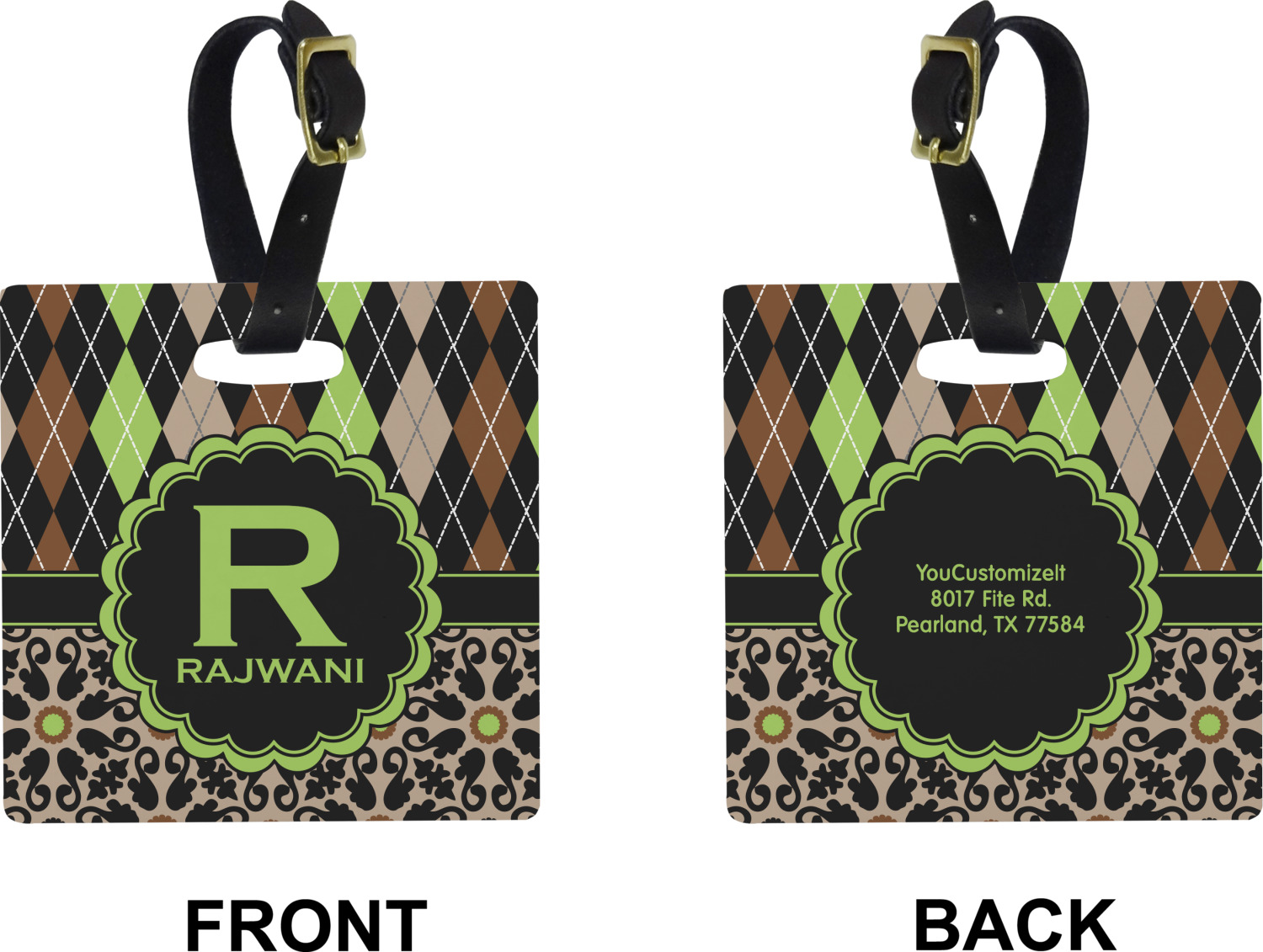 These personalized bag tags are sold in a variety of shapes, so that you may find the product that meets your vision exactly. We sell a round luggage tag, which measures at approximately 4" x 4". Our square luggage tag is about 3.5" x 3.5", while our rectangular version is 2.75" x 4 ".