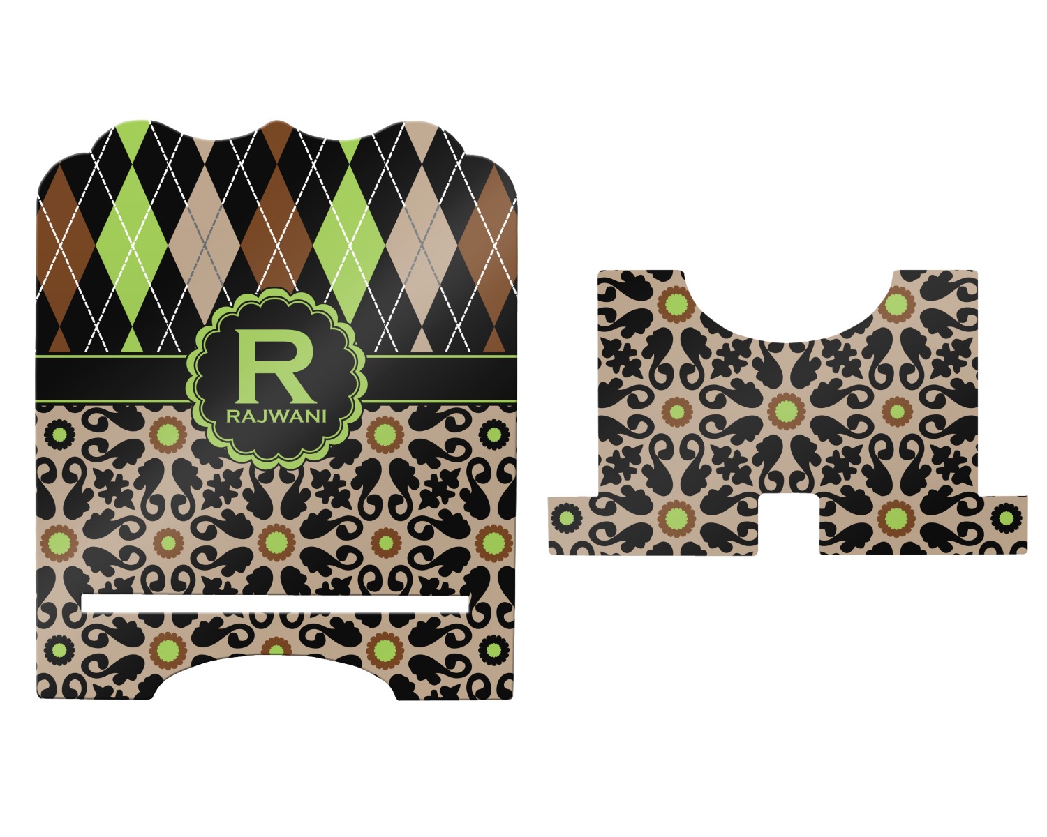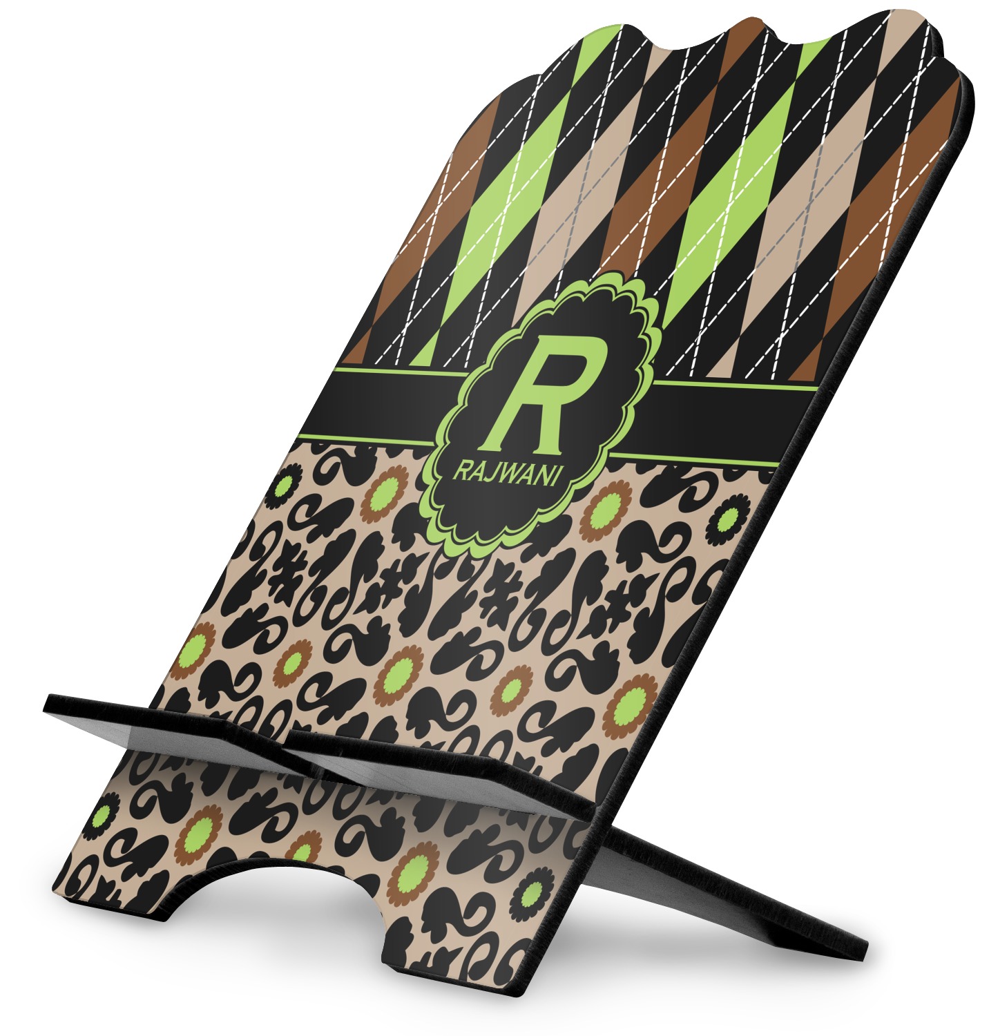 Feminine and masculine collide with this gorgeous design. The top of the design is a contrasting harlequin print in the colors of black, brown, tan, and lime green. The bottom of the design offers a fun girly flair in an abstract pattern in the same colors as the harlequin pattern set against a tan background to create a floral pattern