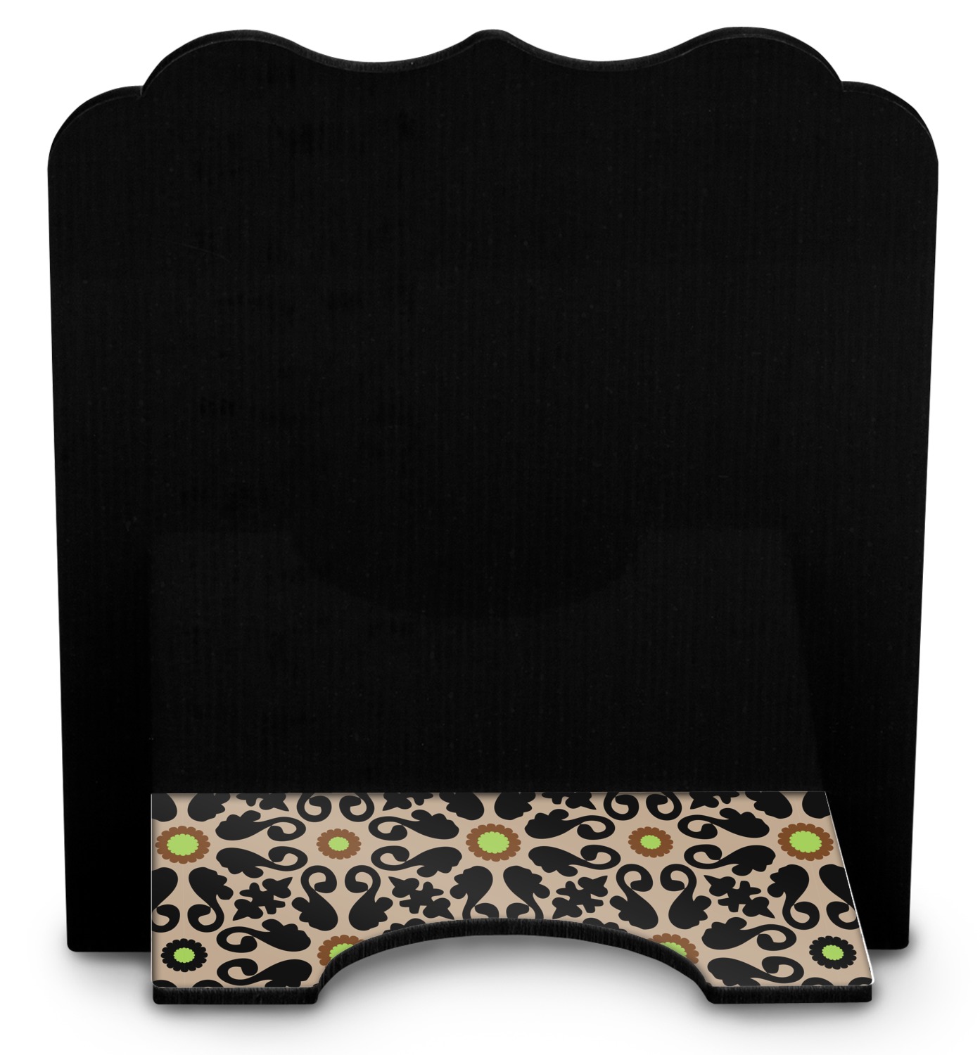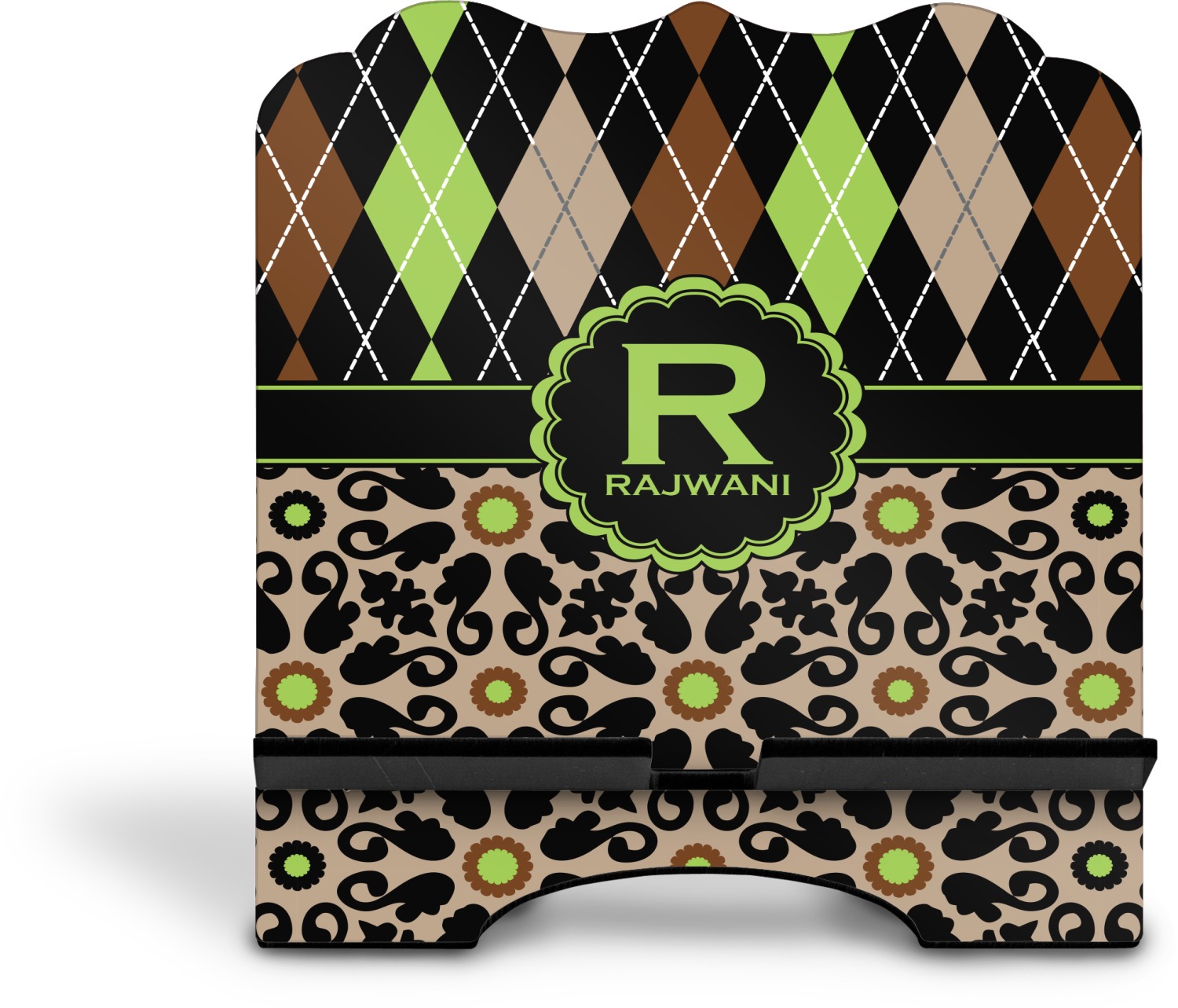 The stand is comprised of two hardboard pieces that fit snugly together and stabilize one another. The bottom part of the iPad stand supports your tablet, and has space for your tablets charger while in use. At 9.25" x 11.5", this tablet mount can support a device between the sizes of the iPad Pro and the iPad Mini 2. The uppermost part of the stand features a decorative, curved edge for a classy, suave appearance. We print your customization atop the face of the stand, in vibrant color. The remaining sides are colored a sleek black.