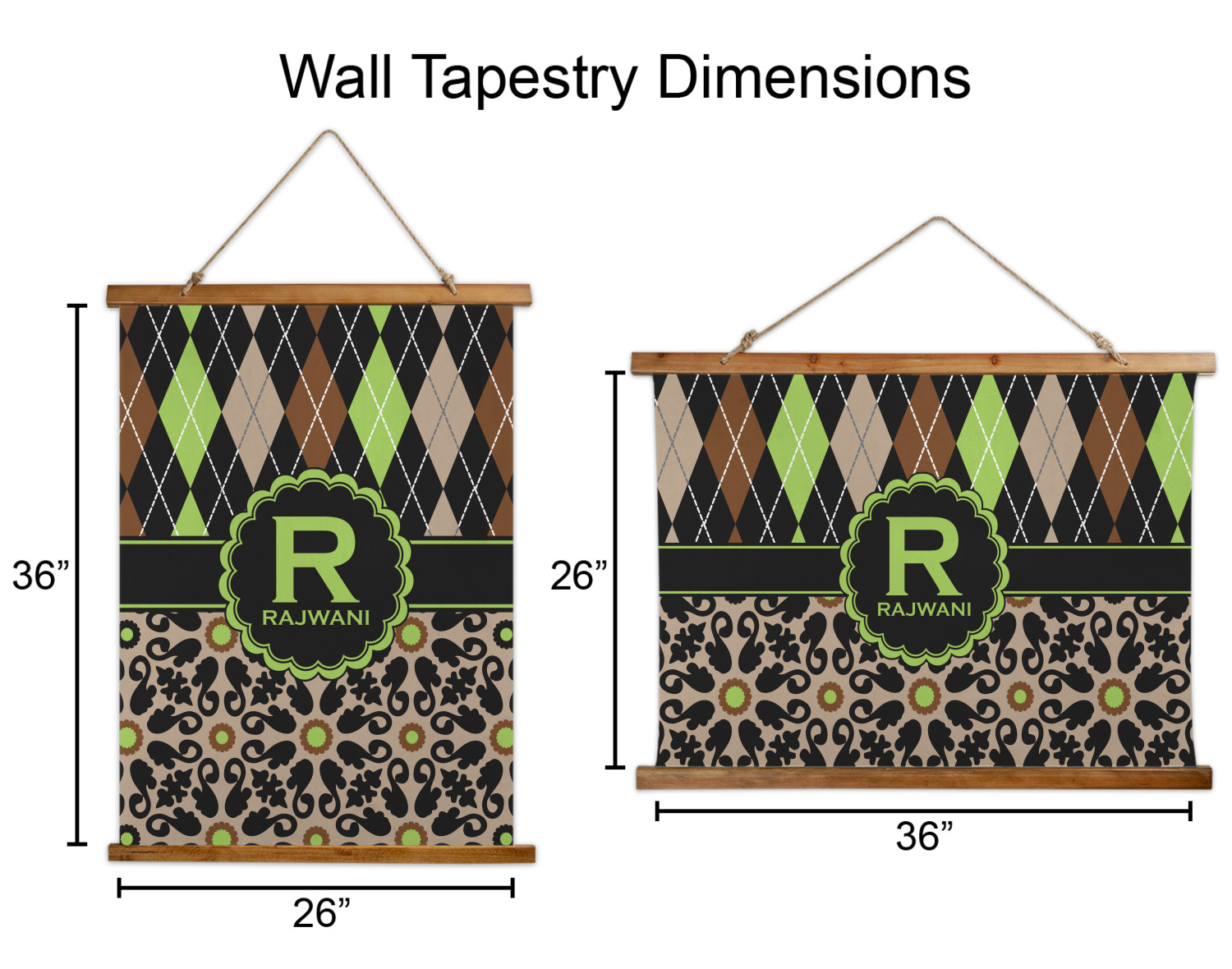 Made in two different orientations - portrait or landscape - both are 26" x 36". Your design is printed on a high quality polyester fabric with hemmed edges. The wood on the top and bottom of the tapestry is 1.25" tall and 0.25" thick and there are two pieces on top and bottom which sandwich the fabric.